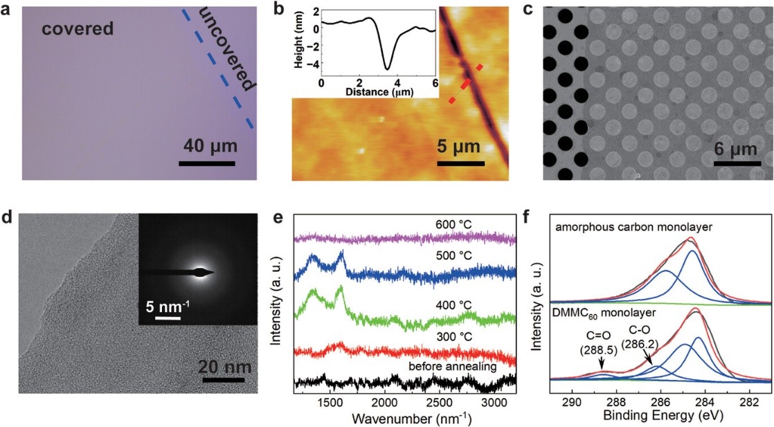 本研究中以改性的富勒烯單體為前驅(qū)體,通過Langmuir-Blodgett制膜-快速熱解兩步法制備了厘米尺寸的單層多孔非晶碳膜。研究證明其為亞穩(wěn)態(tài)結(jié)構(gòu)且不導(dǎo)電。此外,離子跨膜傳輸研究表明該膜具有陽離子選擇性(選擇性為26%)。這項(xiàng)工作對單層多孔非晶碳膜的可控制備具有指導(dǎo)意義。