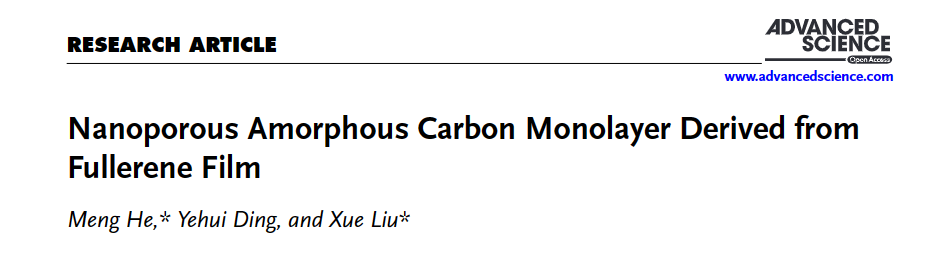 近日,我校新能源學(xué)院新能源材料與器件系青年教師何萌博士為第一作者、西安石油大學(xué)為第一完成單位,在國際頂尖期刊《Advanced Science》(中科院一區(qū)TOP期刊,2022年IF=15.1,近五年IF=16.7)上發(fā)表題為《Nanoporous Amorphous Carbon Monolayer Derived from Fullerene Film》的高水平論文。