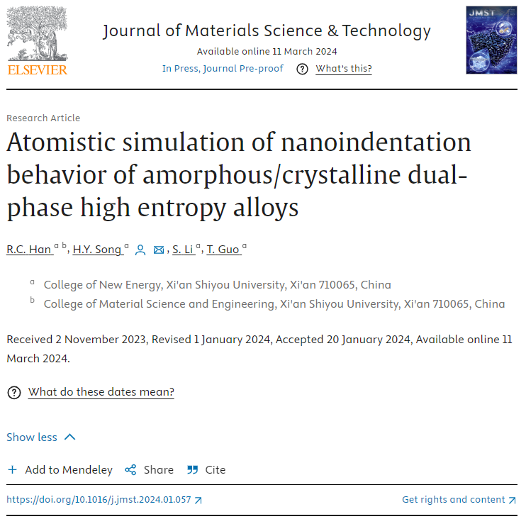 近日,我校2021級(jí)碩士研究生韓若琛以第一作者身份在國(guó)際權(quán)威期刊《Journal of Materials Science & Technology》(中科院一區(qū)TOP期刊,影響因子10.9)上發(fā)表題為“Atomistic simulation of thenanoindentation behavior of the amorphous/crystalline dual-phasehigh entropy alloys”的最新研究成果,此次高水平論文的發(fā)表是該生繼2023年以第一作者身份在中科院一區(qū)TOP期刊上發(fā)表論文以來(lái)取得的又一項(xiàng)研究成果。該生本科就讀于我校計(jì)算機(jī)學(xué)院網(wǎng)絡(luò)工程專(zhuān)業(yè),2021年跨專(zhuān)業(yè)考入我校材料與化工專(zhuān)業(yè)攻讀碩士學(xué)位。這兩項(xiàng)成果均以西安石油大學(xué)為唯一完成單位,該生的研究生導(dǎo)師新能源學(xué)院宋海洋教授為通訊作者。
