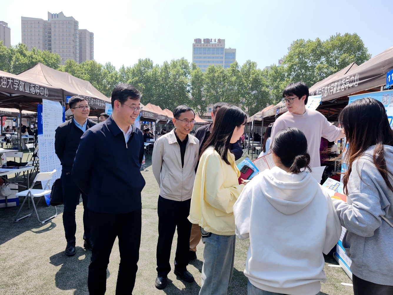 王進富一行還深入招聘會場,詳細了解各單位崗位需求、招聘要求和薪資待遇等,介紹我校專業(yè)設置及人才培養(yǎng)特色,向單位代表長期以來對學校就業(yè)工作的大力支持表示感謝,并與畢業(yè)生親切交談,仔細翻閱畢業(yè)生求職簡歷,詢問畢業(yè)生的求職意向、求職困難等,鼓勵畢業(yè)生要把握住機會,樹立自信、發(fā)揮專業(yè)優(yōu)勢,積極應聘,爭取早日找到稱心如意的崗位。