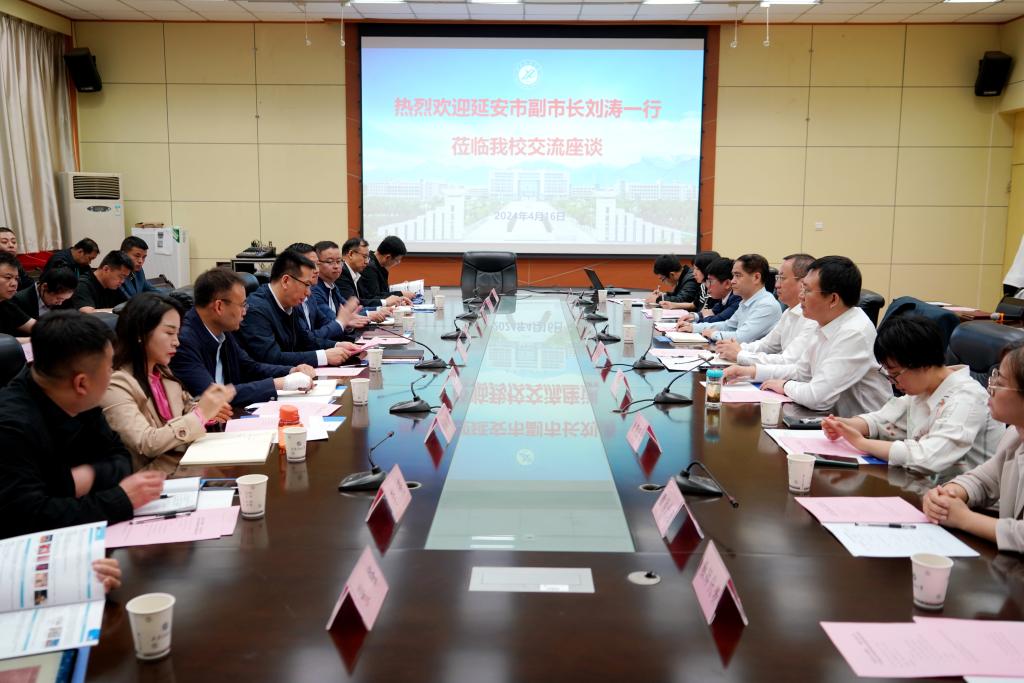 座談會上,張榮軍對劉濤一行到訪學校表示熱烈歡迎,對延安市長期以來對學校發(fā)展的支持與幫助表示感謝,并介紹了學校的發(fā)展歷程和近年來取得的成績。他指出,近年來我校與延安市在科學研究、人才培養(yǎng)、科技成果轉(zhuǎn)化等方面開展了形式多樣的交流合作,取得了豐碩的成果,也結(jié)下了深厚的合作友誼。他希望通過本次交流,進一步夯實雙方的合作基礎,發(fā)揮好各自優(yōu)勢和特色,進一步創(chuàng)新機制、拓寬領域、搭建平臺,深入推進校地校企融合、科教融合、產(chǎn)教融合。他強調(diào),在深化交流合作的新征程上,也非常期待雙方繼續(xù)保持密切交流,厚植情誼,共同探討產(chǎn)學研合作的新模式、新路徑,共同為延安市經(jīng)濟高質(zhì)量發(fā)展提供技術和人才支撐。