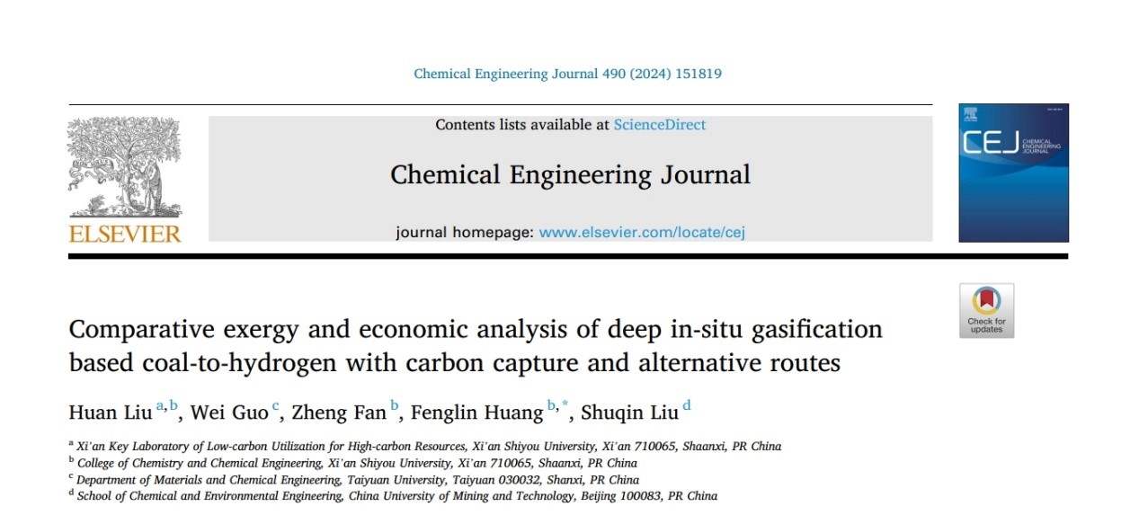 近日,我?;瘜W(xué)化工學(xué)院黃風(fēng)林科研團隊以青年教師劉歡為第一作者、黃風(fēng)林為通訊作者,西安石油大學(xué)為第一署名單位在工程技術(shù)與化工領(lǐng)域最有影響力的三大頂級刊物之一《Chemical Engineering Journal》(JCR、中科院分區(qū)雙一區(qū)TOP期刊,IF=15.1)上發(fā)表題為《Comparative exergy and economic analysis of deep in-situ gasification based coal-to-hydrogen with carbon capture and alternative routes》的高水平論文。