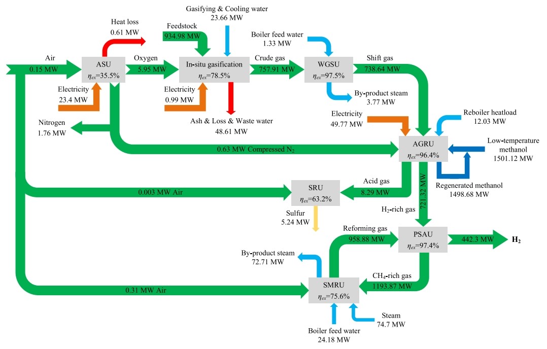 深部煤炭原位氣化制氫作為一種潛在的規(guī)?;夹g(shù)路線,工業(yè)化應(yīng)用前利用熱力學(xué)手段分析其能量轉(zhuǎn)化、利用過程的特點,預(yù)測系統(tǒng)用能的薄弱環(huán)節(jié),可為后續(xù)工藝過程、工藝參數(shù)耦合優(yōu)化提供指導(dǎo)。與現(xiàn)有基于化石能源路線間效率、經(jīng)濟性等方面的定量化分析是提高競爭力,明確技術(shù)可行性與應(yīng)用前景的核心關(guān)鍵。