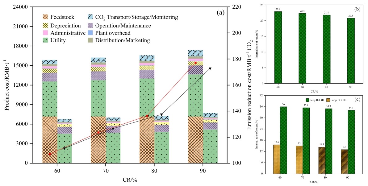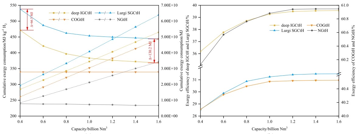 該成果基于世界上唯一的千米級深部煤炭原位氣化試驗數(shù)據(jù),運用?分析方法,以?平衡方程為基礎(chǔ),結(jié)合過程模擬手段,計算了深部煤炭原位氣化制氫從原煤開始到氫氣產(chǎn)品產(chǎn)出的?損失、分布,將?損失細分為可避免/不可避免內(nèi)部損失與可避免/不可避免外部損失四類,進一步分析用能薄弱環(huán)節(jié),確定提高?效率的方法、手段。同時,針對傳統(tǒng)?分析方法視角下效率指標存在?不等價與無法計入非連續(xù)投入能量等問題,創(chuàng)新提出以考慮設(shè)備因素的積累?消耗(CExC)作為衡量過程?效率的指標,據(jù)此明確深部煤炭原位氣化制氫在效率方面的競爭力。結(jié)果表明,深部煤炭原位氣化制氫?損失中存在39.9%的不可避免,而甲烷重整和深部地下氣化具有最大的改進潛力,充分說明通過改進其他過程單元或優(yōu)化工藝結(jié)構(gòu)可實現(xiàn)熱力學(xué)性能的改善。在產(chǎn)出每千克氫氣時深部煤炭原位氣化制氫的CExC僅為傳統(tǒng)煤炭地面氣化制氫的83.6%,表明其是一種更高效的路線,優(yōu)勢隨著規(guī)模的增大會更加明顯,同時投資、成本方面相比后者也具有顯著優(yōu)勢。