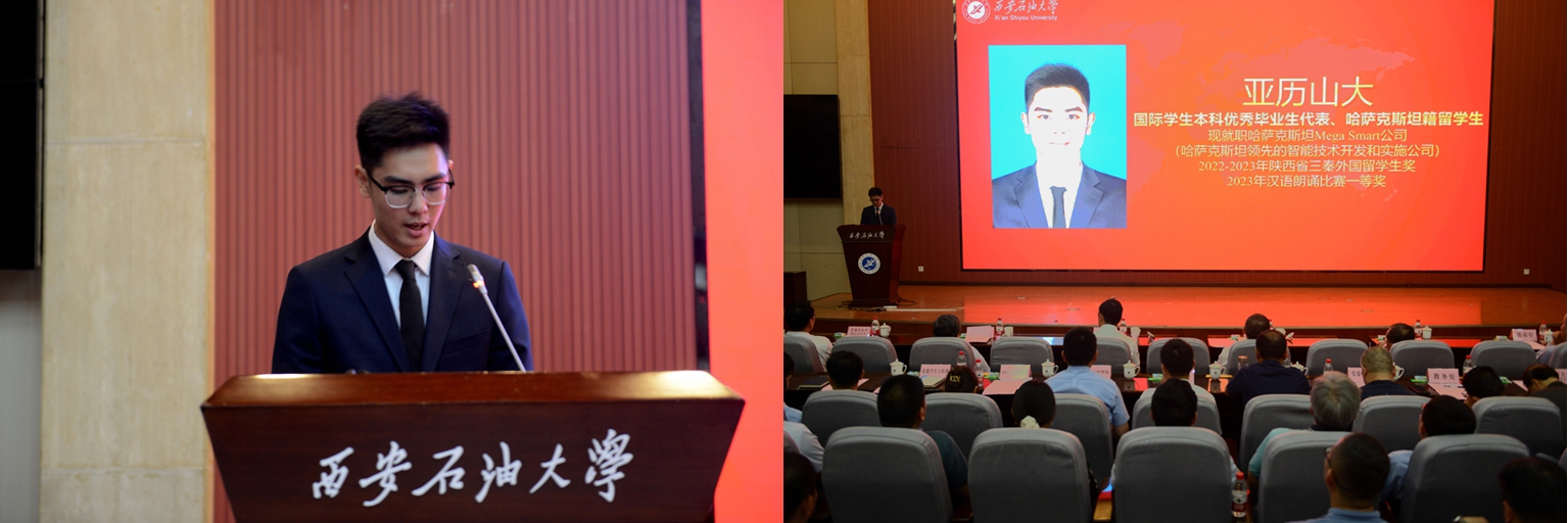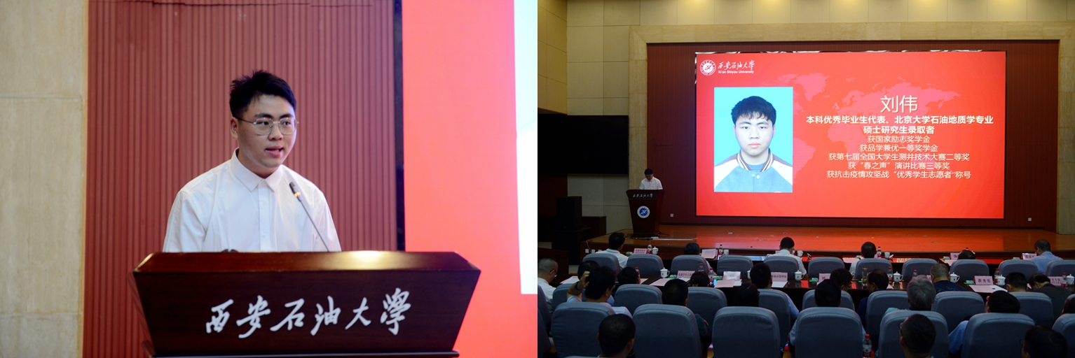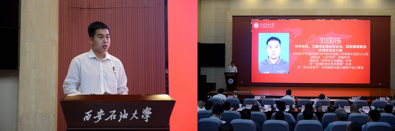 中共黨員、陜西省大學(xué)生自強(qiáng)之星、陜西好青年榮譽(yù)稱號獲得者,石油工程學(xué)院學(xué)生梁歡;本科優(yōu)秀畢業(yè)生代表、北京大學(xué)石油地質(zhì)學(xué)專業(yè)碩士研究生錄取者,地球科學(xué)與工程學(xué)院學(xué)生劉偉;國際學(xué)生本科優(yōu)秀畢業(yè)生代表、哈薩克斯坦籍留學(xué)生,國際教育學(xué)院學(xué)生亞歷山大;中共黨員、碩士研究生優(yōu)秀畢業(yè)生代表、西安交通大學(xué)管理科學(xué)與工程專業(yè)博士研究生錄取者,經(jīng)濟(jì)管理學(xué)院學(xué)生董藝佳;中共黨員、衛(wèi)國戍邊退役畢業(yè)生代表、西部基層就業(yè)優(yōu)秀畢業(yè)生代表,石油工程學(xué)院學(xué)生劉國棟分別作了交流發(fā)言。
