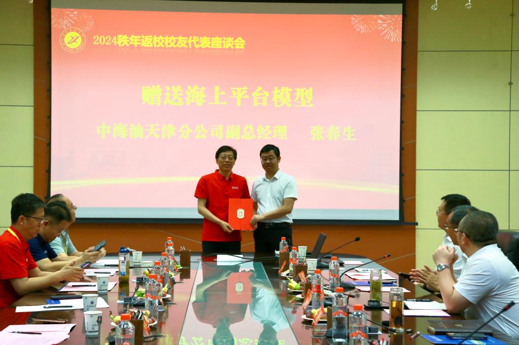 中海油天津分公司張春生校友向學校贈送了海上平臺模型,王進富代表學校接受捐贈并為張春生校友頒發(fā)了捐贈證書。