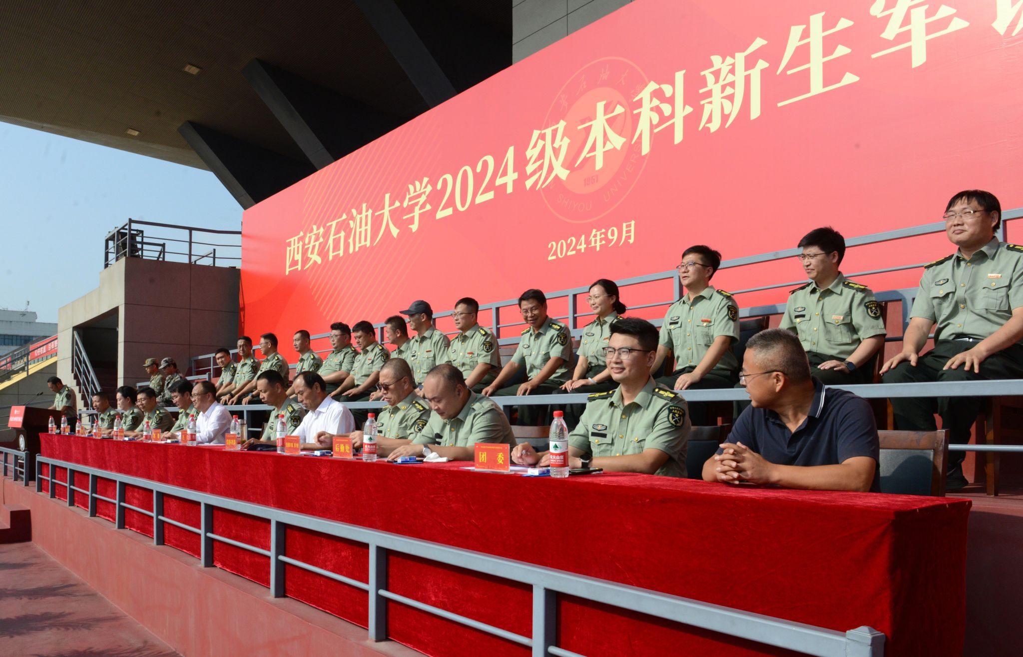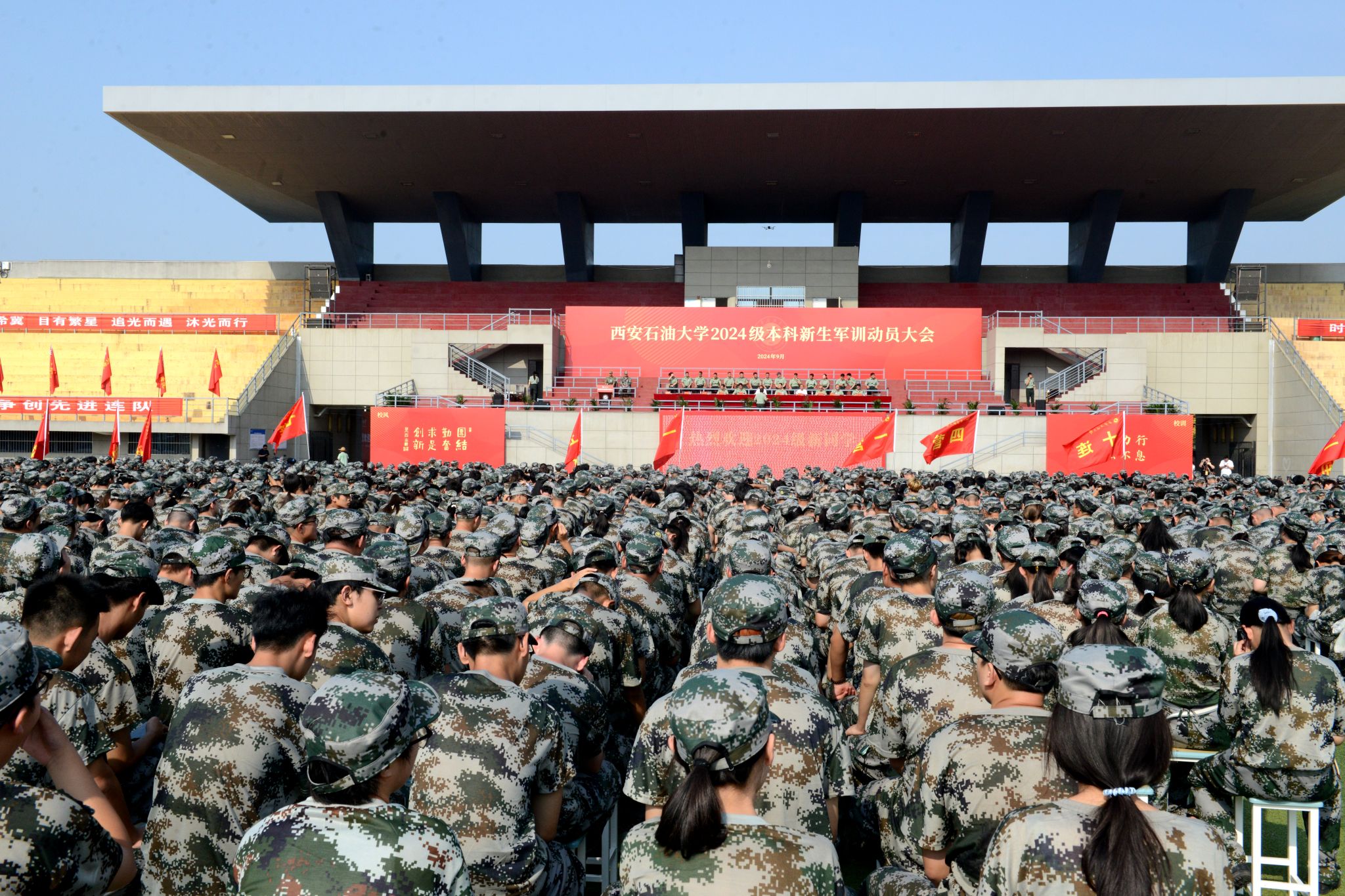 9月4日上午,西安石油大學(xué)2024級本科新生軍訓(xùn)動(dòng)員大會(huì)在鄠邑校區(qū)東田徑場舉行。軍訓(xùn)領(lǐng)導(dǎo)小組組長、副校長趙健,中國人民解放軍某部隊(duì)王林上校出席大會(huì)。黨委辦公室(校長辦公室)、宣傳部、學(xué)生工作部(處)、保衛(wèi)部(處)、團(tuán)委、教務(wù)處、后勤處、校醫(yī)院等相關(guān)部門負(fù)責(zé)人,全體參訓(xùn)學(xué)生工作干部以及2024級全體本科新生參加大會(huì)。