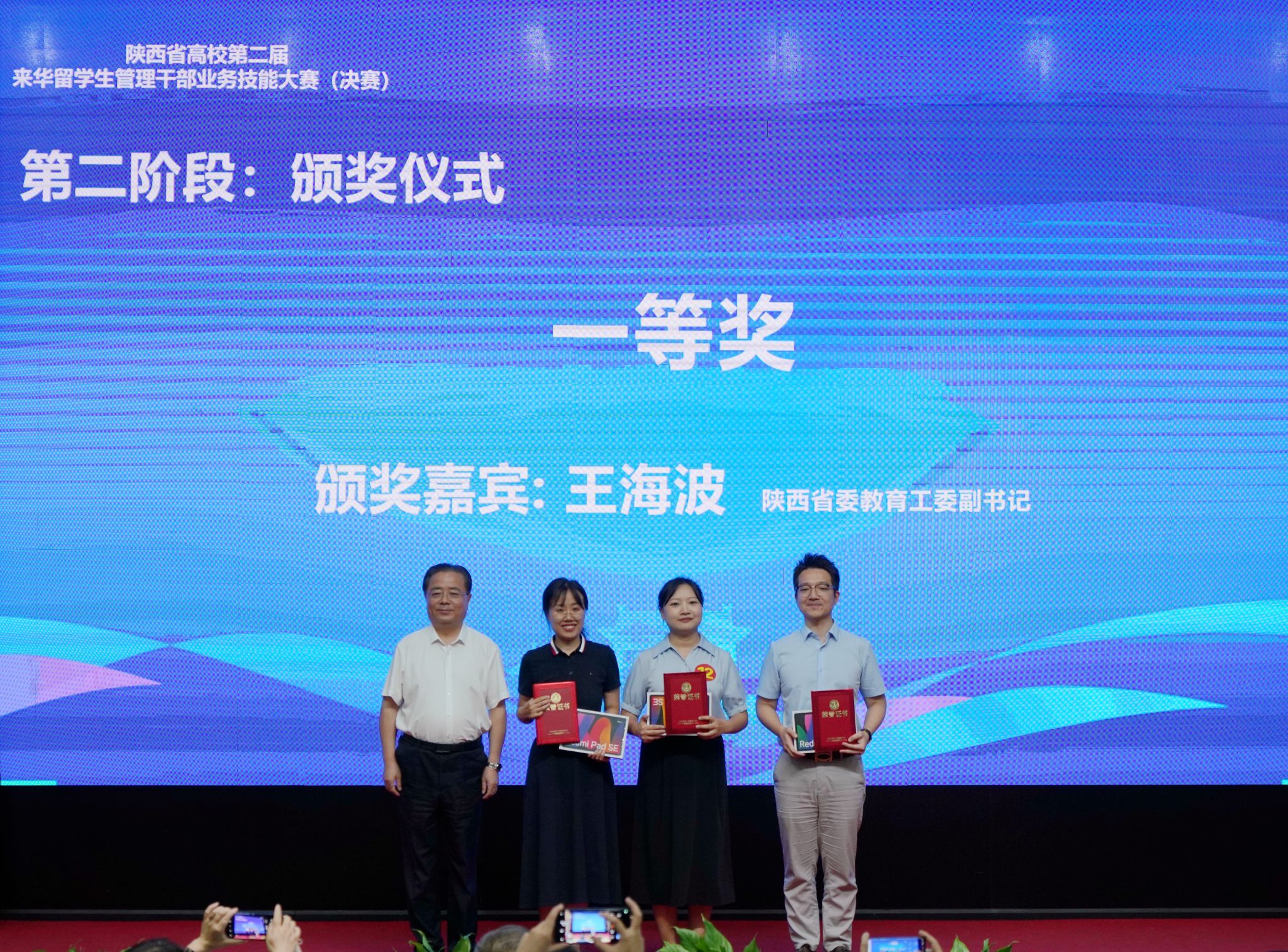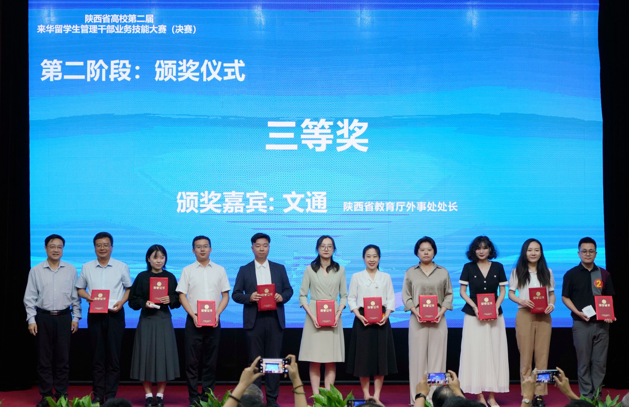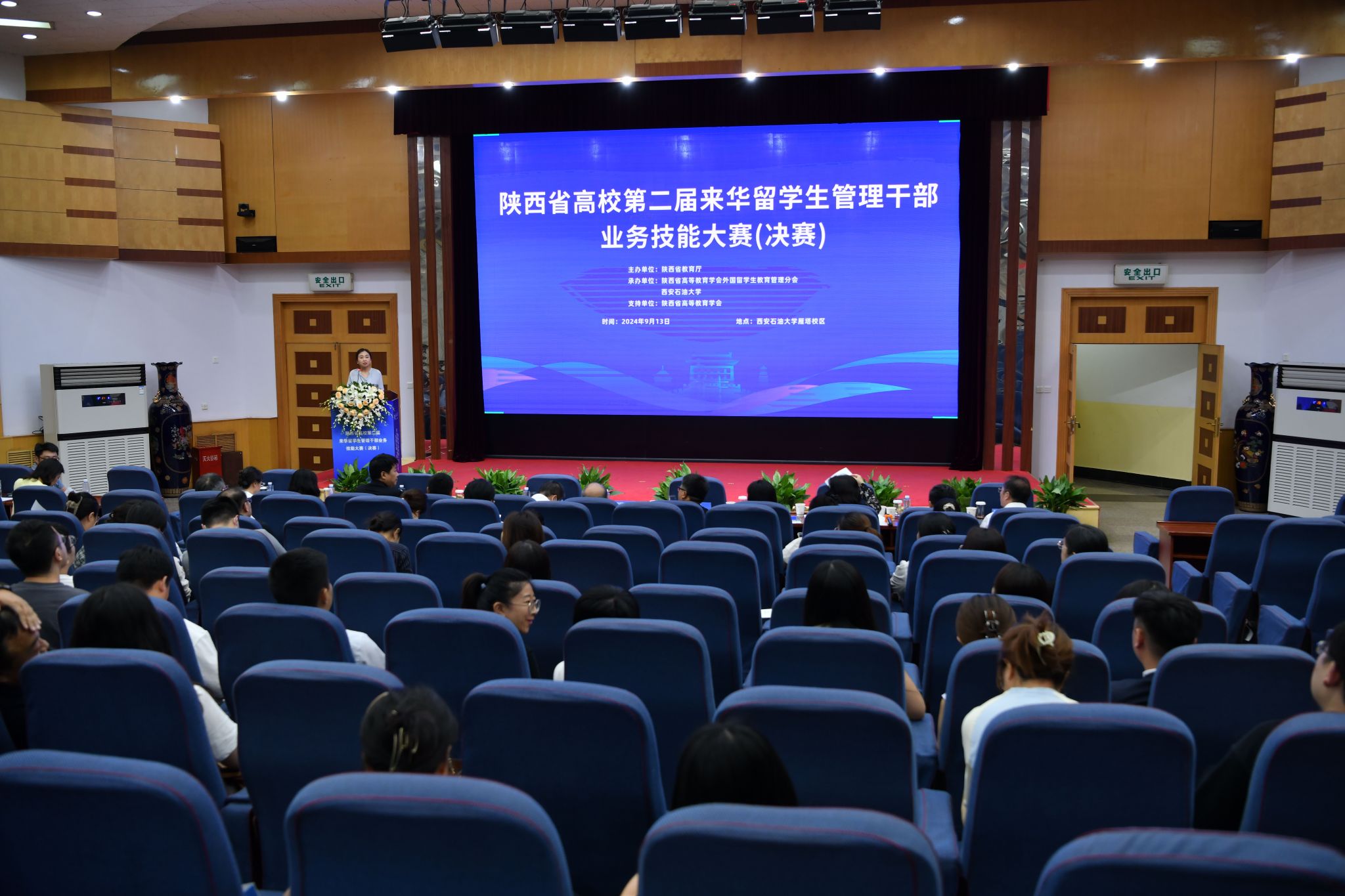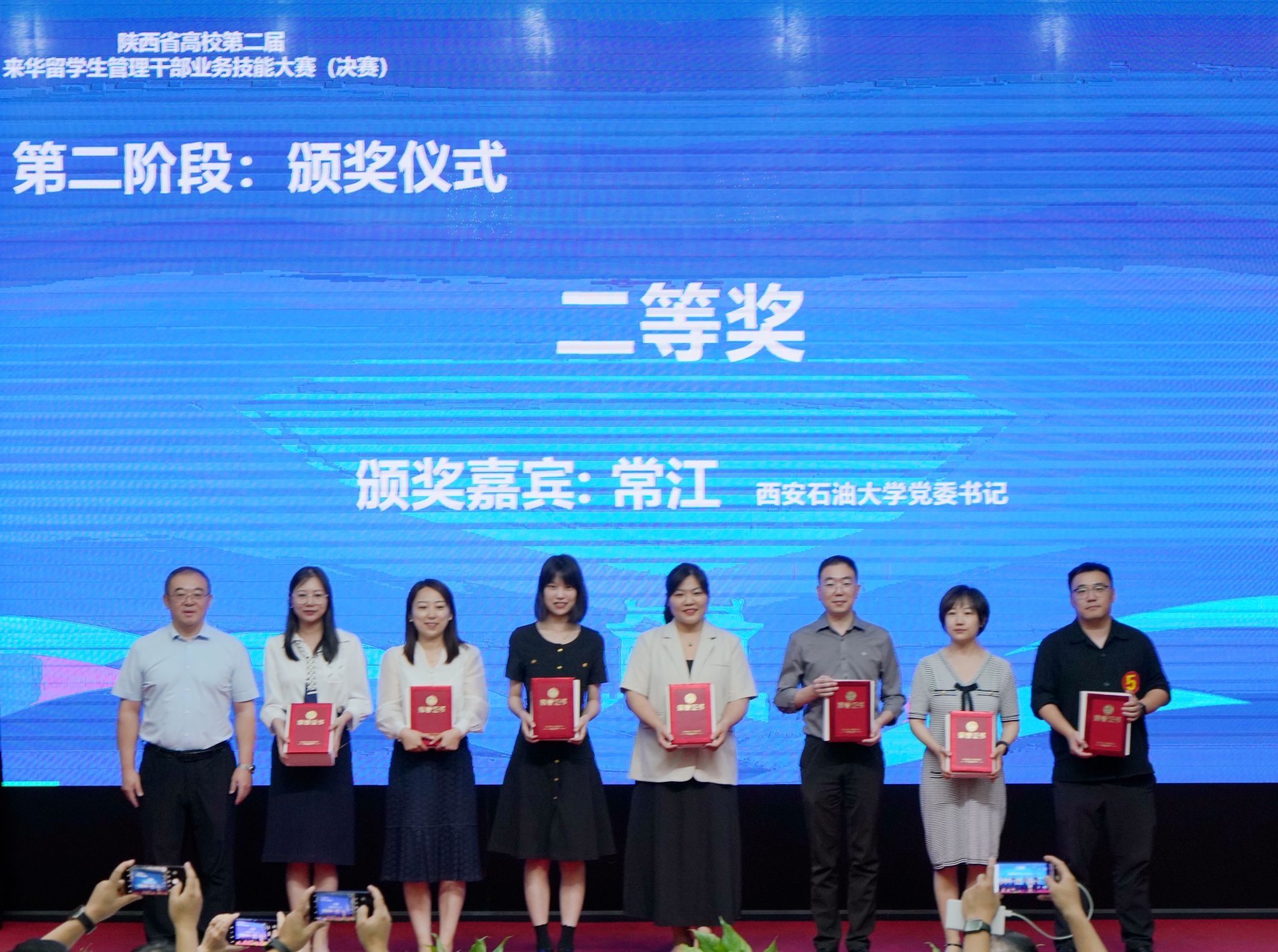 2024年9月13日下午,由陜西省教育廳、陜西省高等教育學(xué)會(huì)主辦,陜西省高等教育學(xué)會(huì)外國(guó)留學(xué)生教育管理分會(huì)、西安石油大學(xué)承辦的陜西省高校第二屆來(lái)華留學(xué)生管理干部業(yè)務(wù)技能大賽(決賽)在我校雁塔校區(qū)成功舉辦。中共陜西省委教育工委副書(shū)記王海波,西安石油大學(xué)黨委書(shū)記常江,陜西省高等教育學(xué)會(huì)副會(huì)長(zhǎng)、我校原黨委書(shū)記惠泱河,省教育廳對(duì)外合作與交流處處長(zhǎng)文通等出席大賽頒獎(jiǎng)儀式,并分別為一、二、三等獎(jiǎng)獲得者頒發(fā)獲獎(jiǎng)證書(shū)和紀(jì)念品,副校長(zhǎng)張榮軍主持頒獎(jiǎng)儀式。