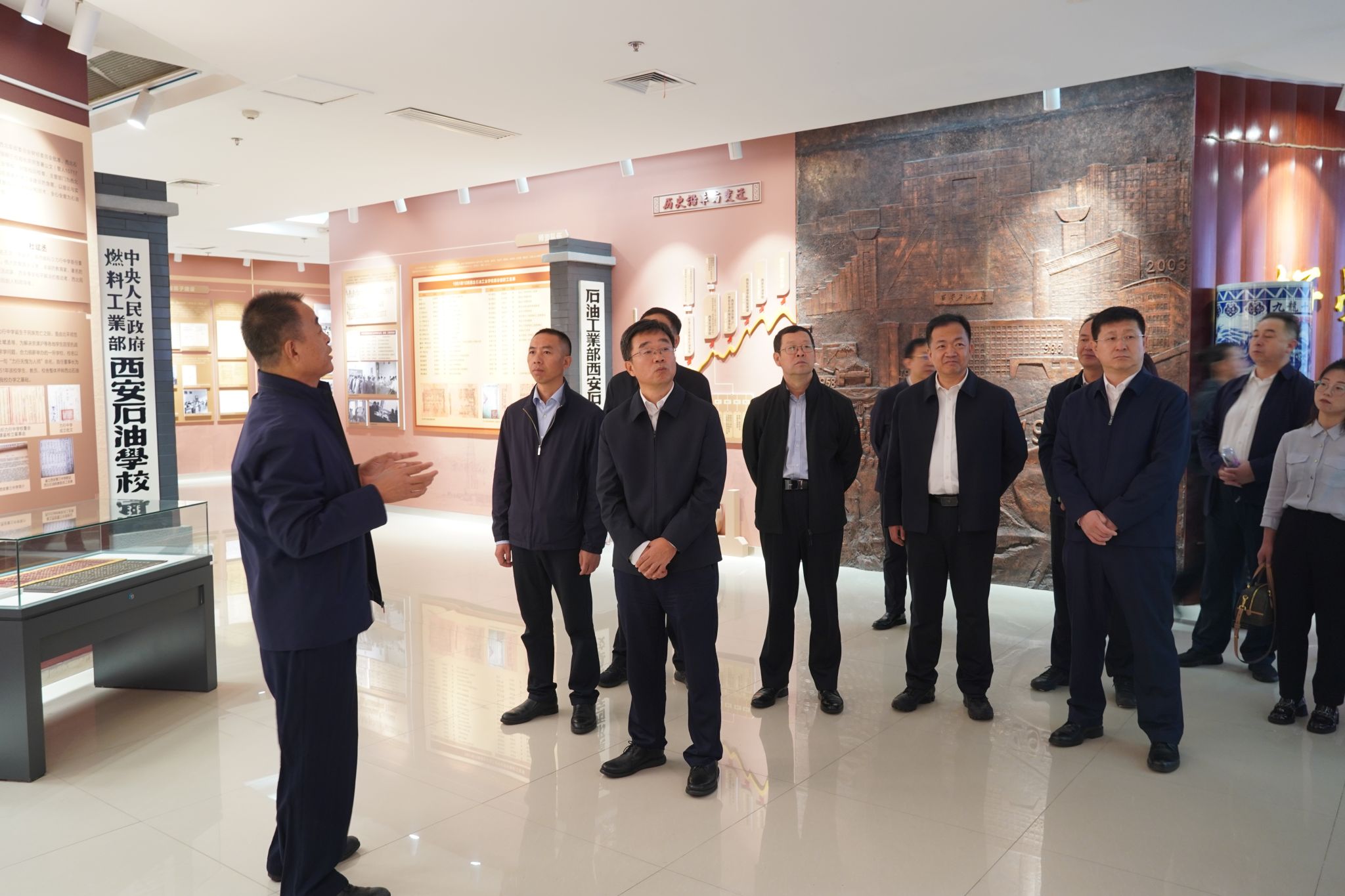12日上午,王進富陪同魏兆勝一行參觀了校史館、鐵人館和鄠邑校區(qū)。校黨委副書記程永清向大家詳細介紹了學(xué)校70余年來的輝煌歷程、取得的辦學(xué)成就以及“鐵人”王進喜的光輝事跡。