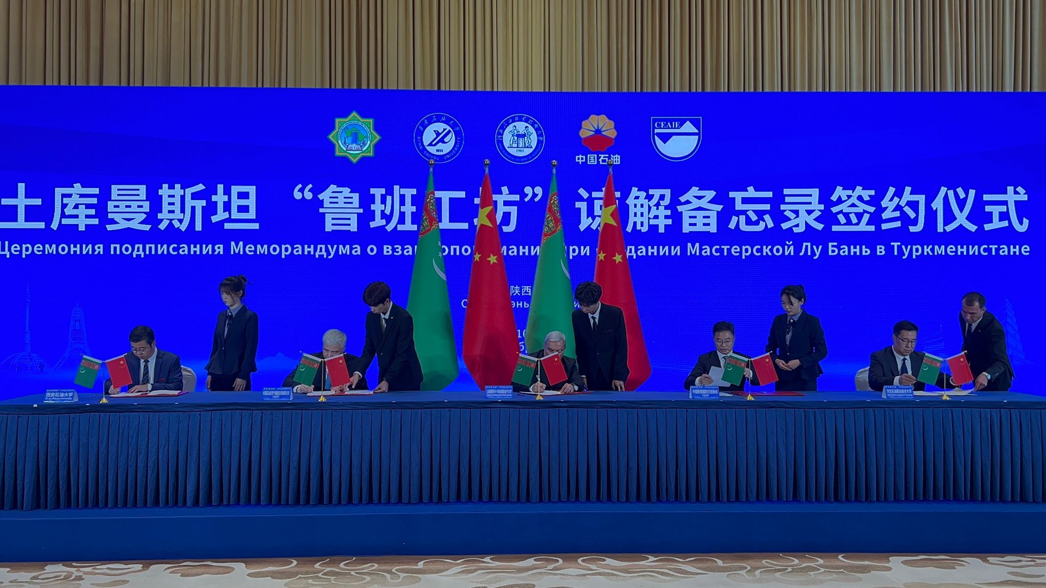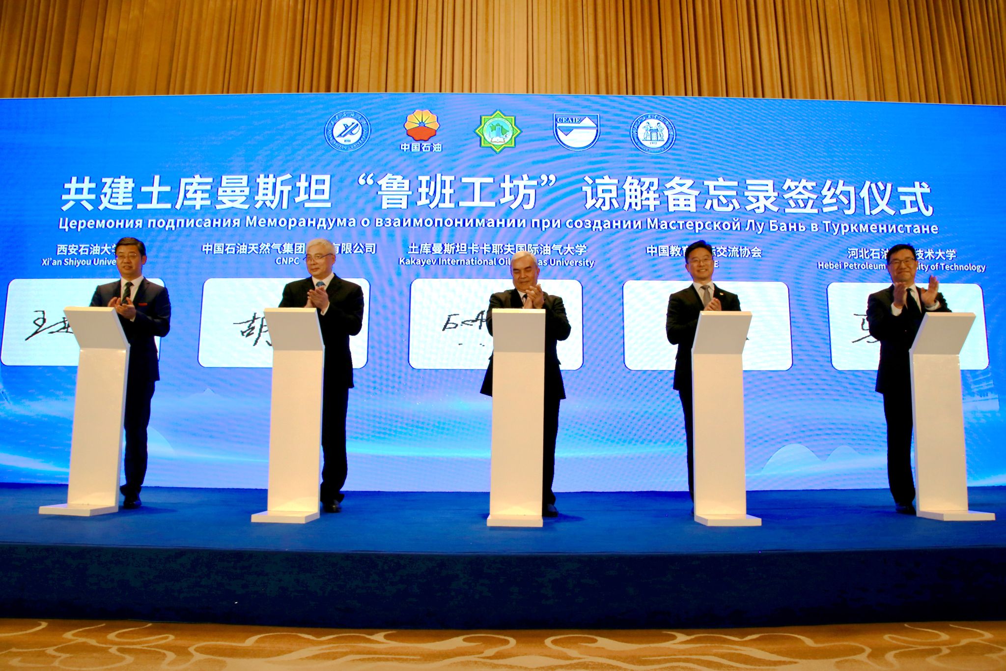 18日下午,共建土庫(kù)曼斯坦“魯班工坊”諒解備忘錄簽約儀式在陜西賓館成功舉行。土庫(kù)曼斯坦卡卡耶夫油氣大學(xué)校長(zhǎng)拜拉姆穆拉特·阿塔馬諾夫、西安石油大學(xué)校長(zhǎng)王進(jìn)富、河北石油職業(yè)技術(shù)大學(xué)副校長(zhǎng)馬顯才、中國(guó)教育國(guó)際交流協(xié)會(huì)秘書長(zhǎng)楊軍、中國(guó)石油天然氣集團(tuán)有限公司人力資源部副總經(jīng)理胡紅民分別代表中土共建各方共同簽署《土庫(kù)曼斯坦魯班工坊諒解備忘錄》。