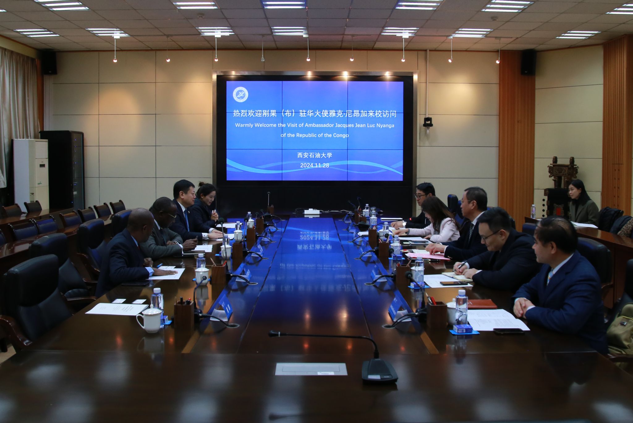 11月28日上午,剛果(布)共和國(guó)駐華大使雅克·尼昂加(Jacques Nyanga、剛果(布)駐華教育參贊艾梅·埃托卡·貝卡(AiméEtoka-beka)及油升聯(lián)國(guó)際有限公司總裁邵森、總經(jīng)理助理宋白鶴等一行來(lái)校訪問(wèn)。校長(zhǎng)王進(jìn)富會(huì)見(jiàn)代表團(tuán)一行,副校長(zhǎng)張榮軍出席政校企三方合作座談會(huì),座談會(huì)在雁塔校區(qū)會(huì)議中心第二會(huì)議室召開(kāi)。