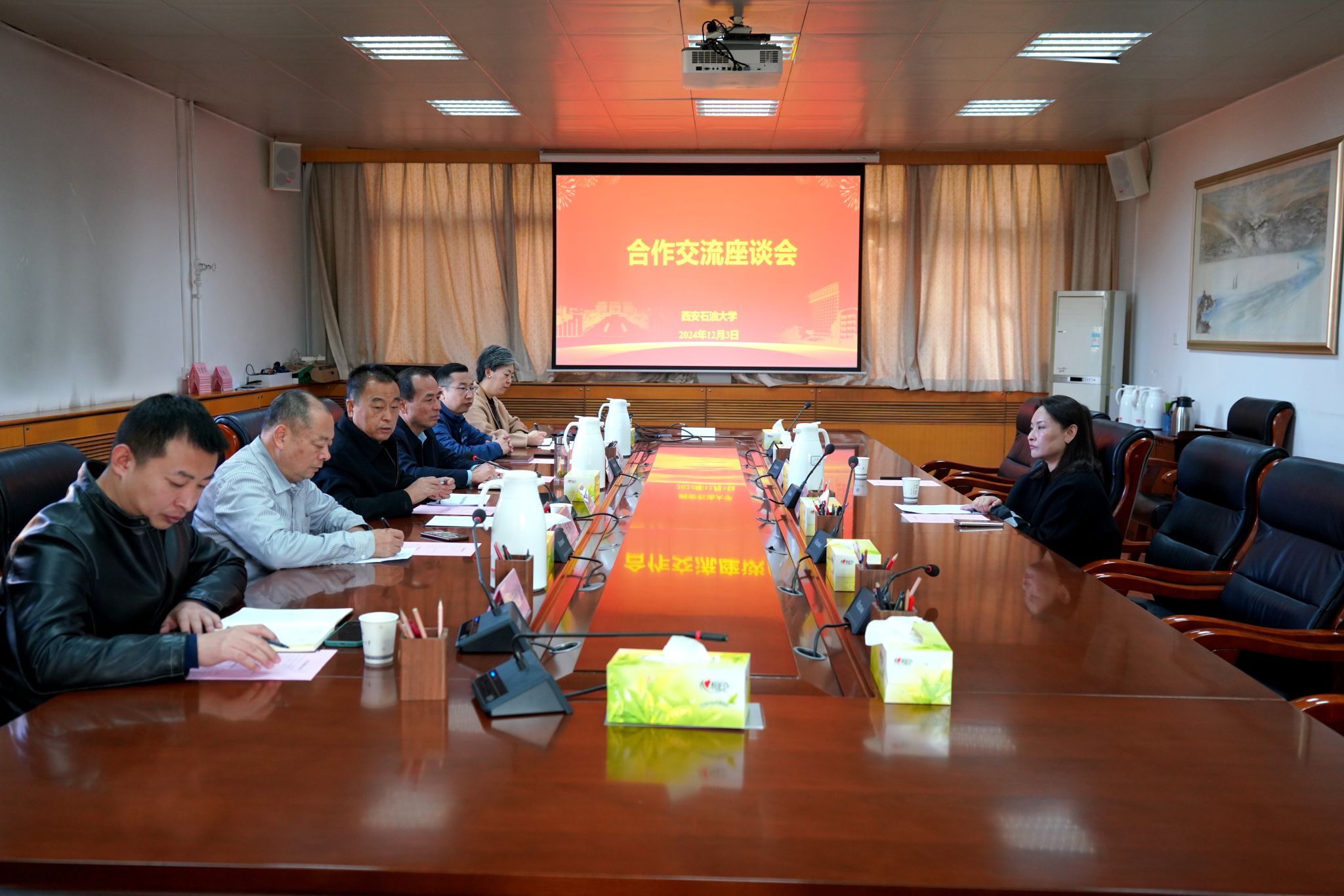 隨后,學(xué)校在雁塔校區(qū)行政樓五樓會議室召開合作交流座談會,程永清主持并講話,王婧女士出席座談,黨委宣傳部、校友工作與合作交流處、后勤處、檔案館等部門負(fù)責(zé)人和有關(guān)人員參加會議。