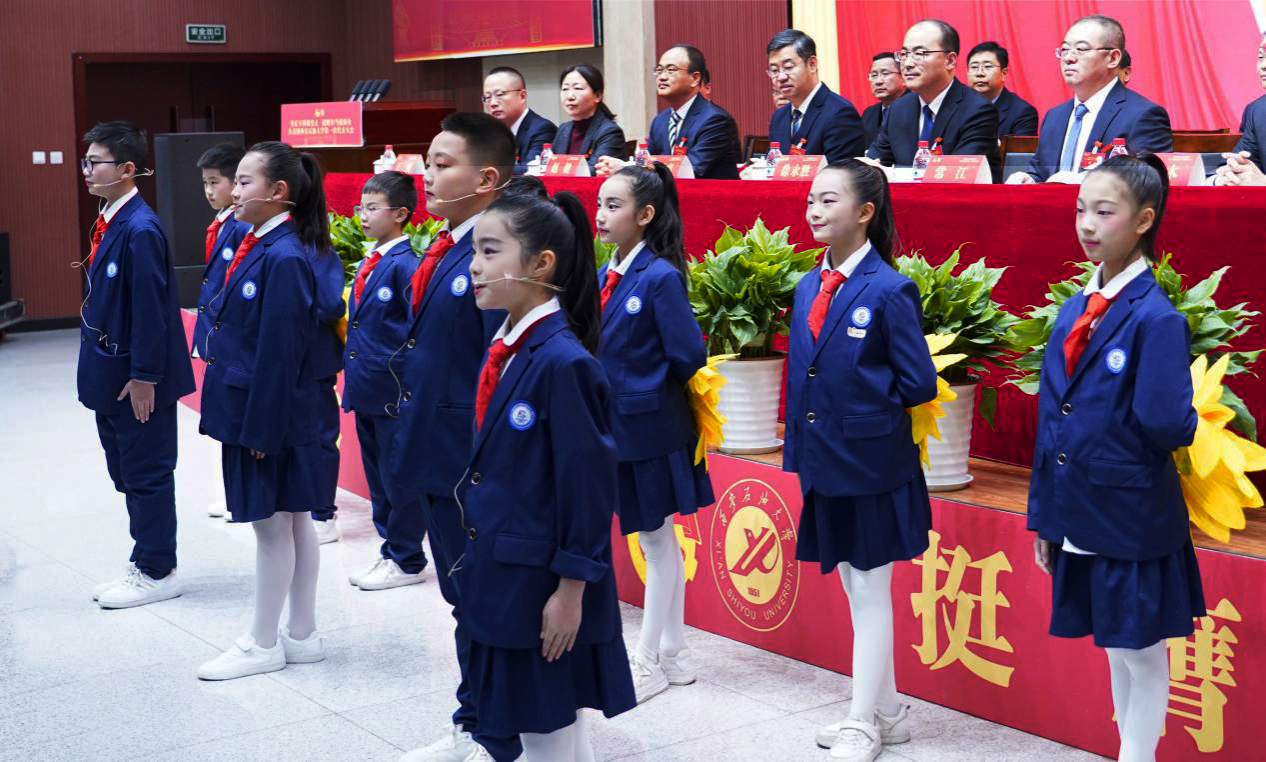 西安濱河榮華實驗小學少先隊員代表在大會開幕式獻詞。