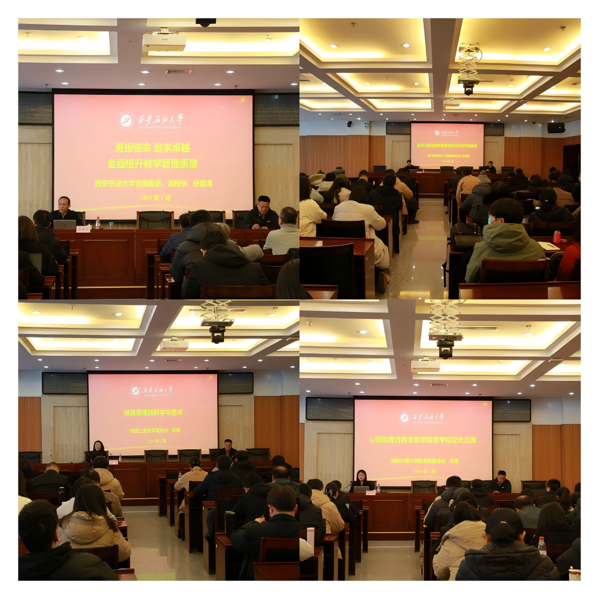 在教學(xué)系統(tǒng)干部專題培訓(xùn)中,副校長張君濤以《勇?lián)姑非笞吭饺嫣嵘虒W(xué)管理質(zhì)量》為題向全體教學(xué)系統(tǒng)干部作專題輔導(dǎo)報(bào)告。報(bào)告包括高等教育教學(xué)的新形勢、學(xué)校本科教學(xué)的新任務(wù)和教學(xué)管理人員的新要求等三個部分,他從實(shí)施鑄魂育人行動、培養(yǎng)體系創(chuàng)新計(jì)劃、專業(yè)內(nèi)涵提升計(jì)劃、數(shù)智賦能教學(xué)計(jì)劃、科教產(chǎn)教融合計(jì)劃、教學(xué)質(zhì)量提升計(jì)劃、一流師資隊(duì)伍建設(shè)和教學(xué)國際化行動等八個方面系統(tǒng)闡述了學(xué)校本科教學(xué)的預(yù)期目標(biāo)。他表示教學(xué)管理人員要發(fā)揚(yáng)三種精神、強(qiáng)化五個意識、提升五種能力,成為教學(xué)理念創(chuàng)新與變革的引領(lǐng)者、教學(xué)秩序與質(zhì)量穩(wěn)定提升的保障者、教師專業(yè)成長與發(fā)展的促進(jìn)者、教育資源優(yōu)化與整合的推動者和學(xué)校教學(xué)質(zhì)量文化與品牌的塑造者,為如何開展好學(xué)校教育教學(xué)工作提供了很好的啟示和有力的指導(dǎo)。同時,西北農(nóng)林科技大學(xué)原教務(wù)處處長陳遇春作《新時代高校教學(xué)管理的方法論與行動自覺》專題講座,闡述了教學(xué)管理的內(nèi)涵與體系,明確了教學(xué)管理者的職責(zé)定位及工作重點(diǎn),對提升教學(xué)管理的整體效能提供了寶貴經(jīng)驗(yàn)。西安工業(yè)大學(xué)副校長閆莉作《教務(wù)管理的科學(xué)與藝術(shù)》專題講座,闡釋了教務(wù)管理科學(xué)性與藝術(shù)性的意義,講解了教務(wù)管理的科學(xué)依據(jù)與實(shí)踐方案,結(jié)合實(shí)際案例分享了西安工業(yè)大學(xué)教學(xué)管理的具體舉措及工作思考,引導(dǎo)教學(xué)系統(tǒng)干部創(chuàng)新理念、科學(xué)規(guī)劃、精準(zhǔn)施策,為優(yōu)化教育教學(xué)工作提供了行之有效的管理思路和舉措。西安交通大學(xué)教務(wù)處副處長李涓作《AI賦能教育教學(xué)改革的思考和交大方案》專題講座,分析了國內(nèi)外高校人工智能賦能教育的背景與趨勢,結(jié)合交大實(shí)際系統(tǒng)講授了AI+專業(yè)、AI+課程、AI+教學(xué)、AI+學(xué)習(xí)、AI+評價、AI+資源、AI+平臺等七個方面的交大方案與實(shí)踐,分享了對AI賦能教育教學(xué)改革的思考,展望了智慧教學(xué)的未來。