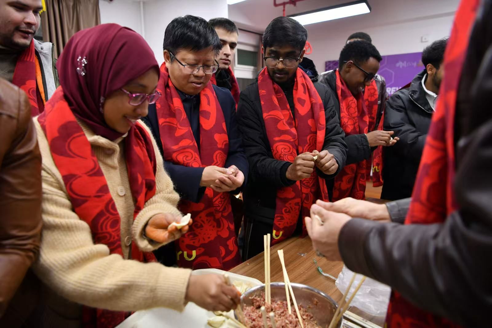 慰問期間,張驍勇與國際學生們一道實踐,親自示范包餃子的方法和蛇形剪紙技巧。大家圍坐在一起,歡聲笑語不斷,共同慶祝農(nóng)歷新年的到來。