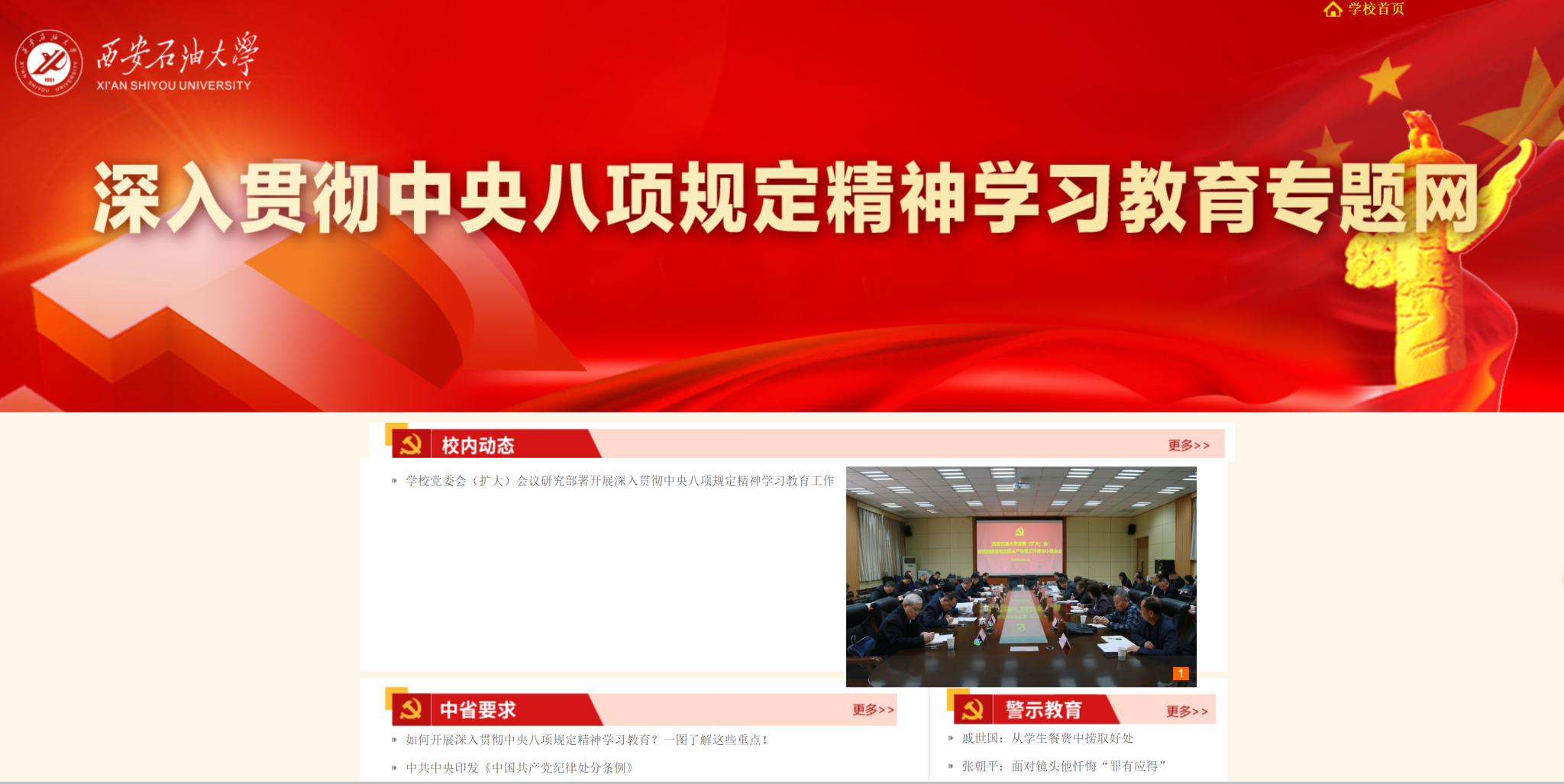 網(wǎng)站設(shè)置了“校內(nèi)動態(tài)”“中省要求”“理論學(xué)習(xí)”“警示教育”四個欄目?!靶?nèi)動態(tài)”報道我校及各部門、各院系開展學(xué)習(xí)教育活動的動態(tài)新聞;“中省要求”傳達中央、陜西省開展深入貫徹中央八項規(guī)定精神學(xué)習(xí)教育的部署要求;“理論學(xué)習(xí)”轉(zhuǎn)載權(quán)威專家對中央八項規(guī)定精神的解讀文章,以及主流媒體關(guān)于學(xué)習(xí)教育活動的言論評述;“警示教育”主要展示違反中央八項規(guī)定精神的典型案例、深度剖析。