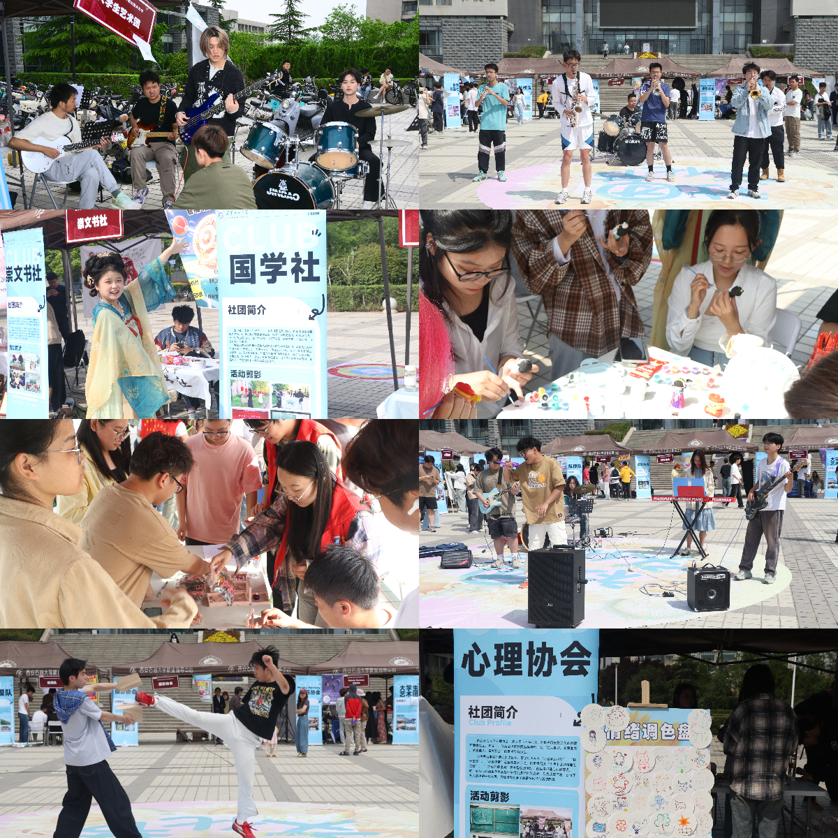 在鄠邑校區(qū)圖書館南廣場的“文化共賞長廊”外展活動現(xiàn)場,青春激昂,氣氛熱烈,心理協(xié)會的“解憂調(diào)色盤”,新聞社的“DIY制作”,書畫協(xié)會的“書法送祝?!?,可謂妙筆生花;山海史學(xué)社、通訊社、未來運(yùn)動社更是推陳出新,創(chuàng)新版拼圖復(fù)原、五子對弈、投壺比賽無不是競技與實力的比拼;大學(xué)生藝術(shù)團(tuán)、民謠社、附點(diǎn)八分音樂社更是為活動現(xiàn)場提供了極致的視聽盛宴;崇文書社、國學(xué)社也帶來了唯美的古典美學(xué);辯論社、演講與禮儀協(xié)會更是將語言與辭藻之魅力展現(xiàn)的淋漓盡致。