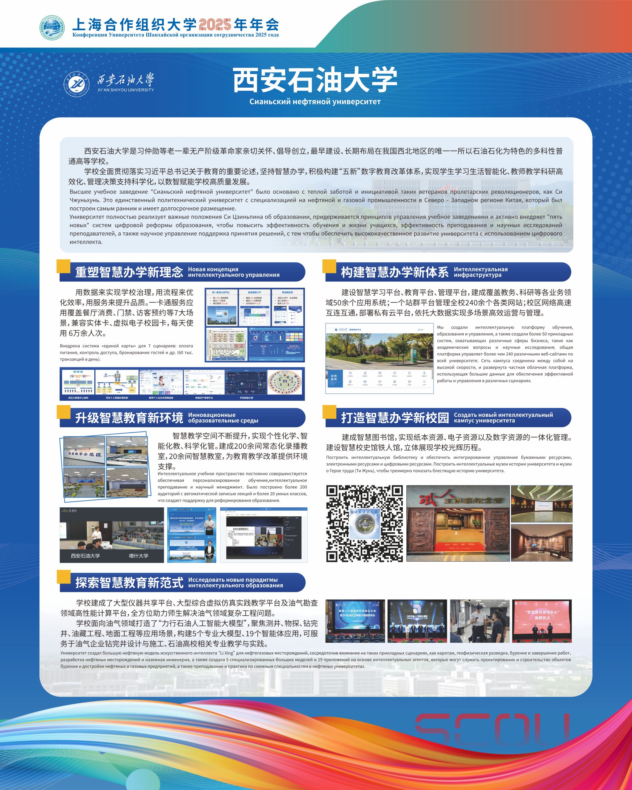 年會開幕式開始前,與會嘉賓在新疆國際會展中心現(xiàn)場參觀了上海合作組織大學(xué)(中國)數(shù)字教育成果展。西安交通大學(xué)、新疆大學(xué)、華北電力大學(xué)、西安石油大學(xué)等23所上海合作組織大學(xué)中方成員高校參展,向與會各國嘉賓集中展示了我國高校數(shù)字教育的最新建設(shè)成果。