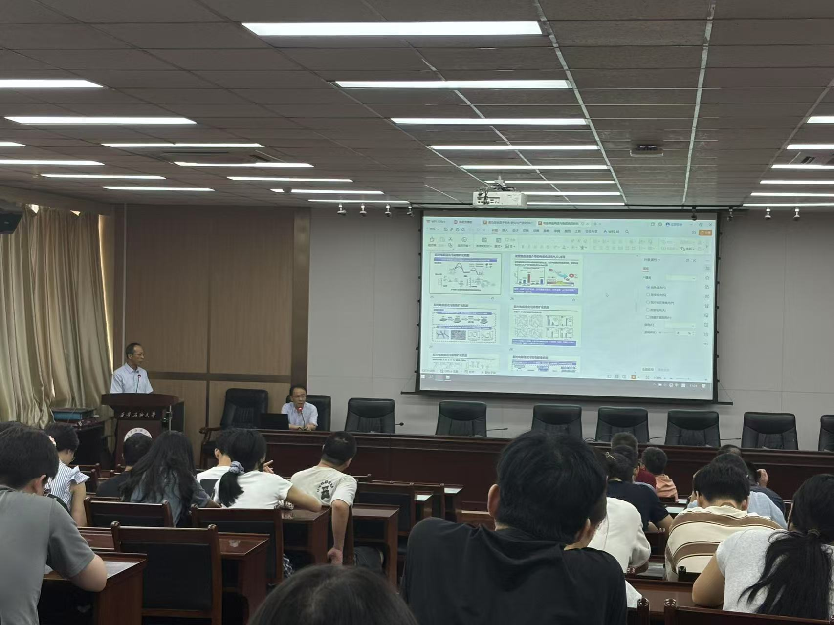 李景虹院士系統(tǒng)闡述了高功率鈉離子電池在能源領(lǐng)域的關(guān)鍵作用,深入剖析了電極材料設(shè)計和界面調(diào)控中的關(guān)鍵科學(xué)問題,并分享了團隊在此領(lǐng)域研究中的突破性成果。報告會現(xiàn)場氣氛熱烈,學(xué)術(shù)氛圍濃厚,在互動交流環(huán)節(jié),師生們踴躍提問、積極發(fā)言,李景虹院士從專業(yè)角度逐一給予詳細解答。