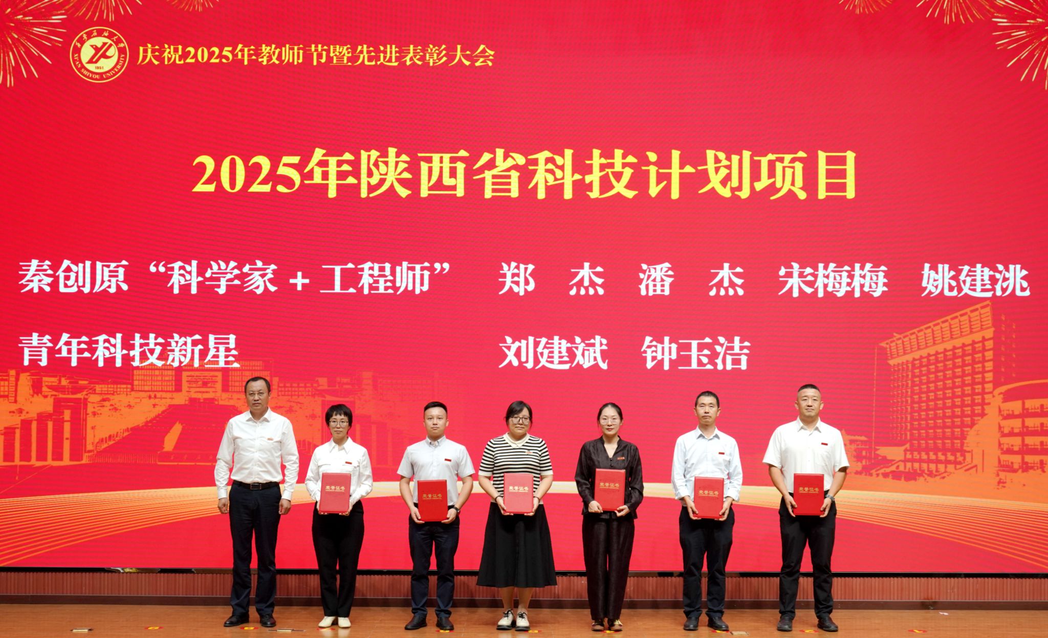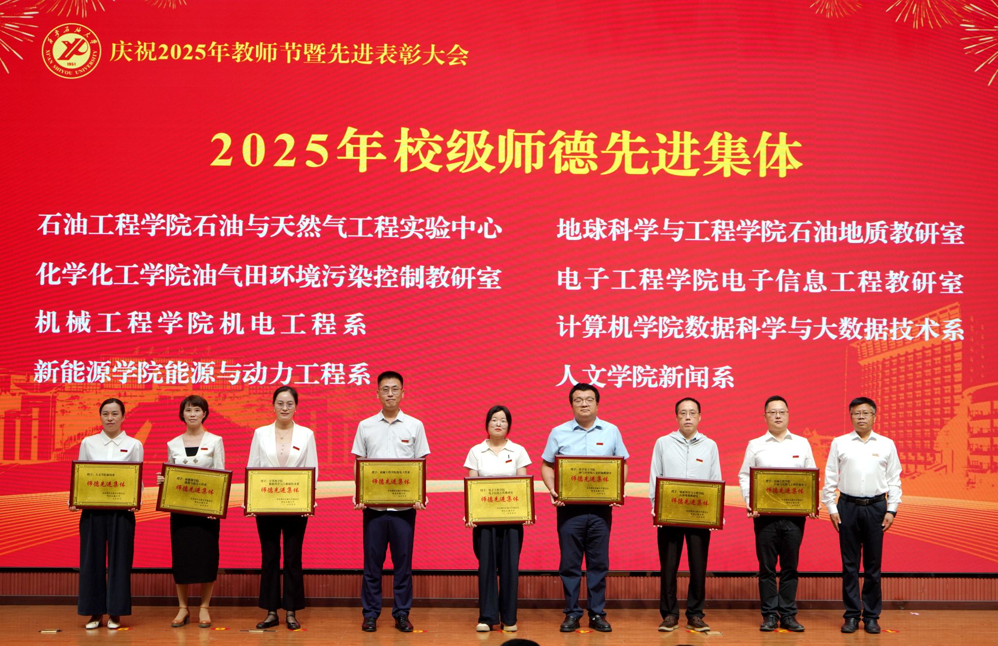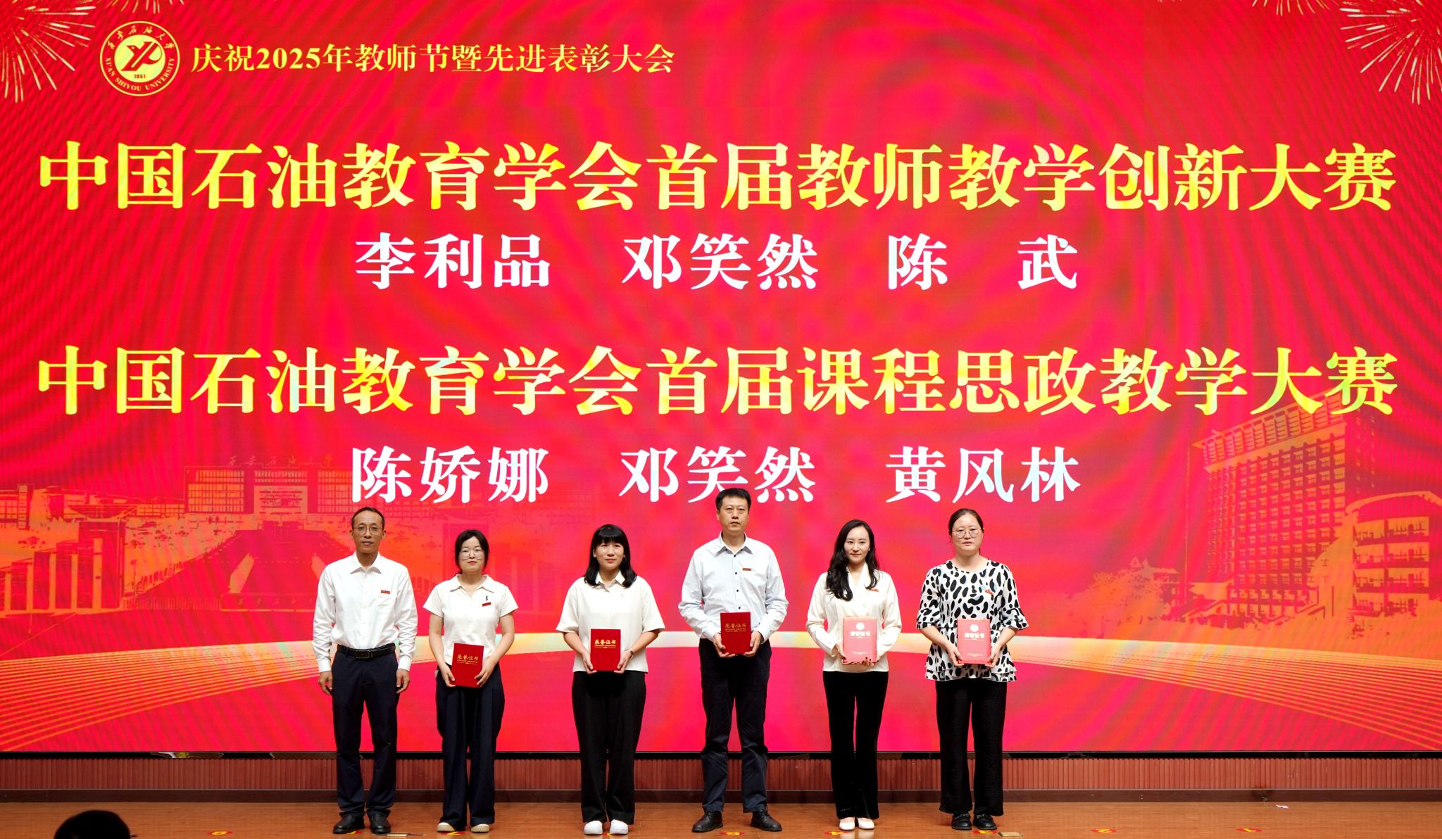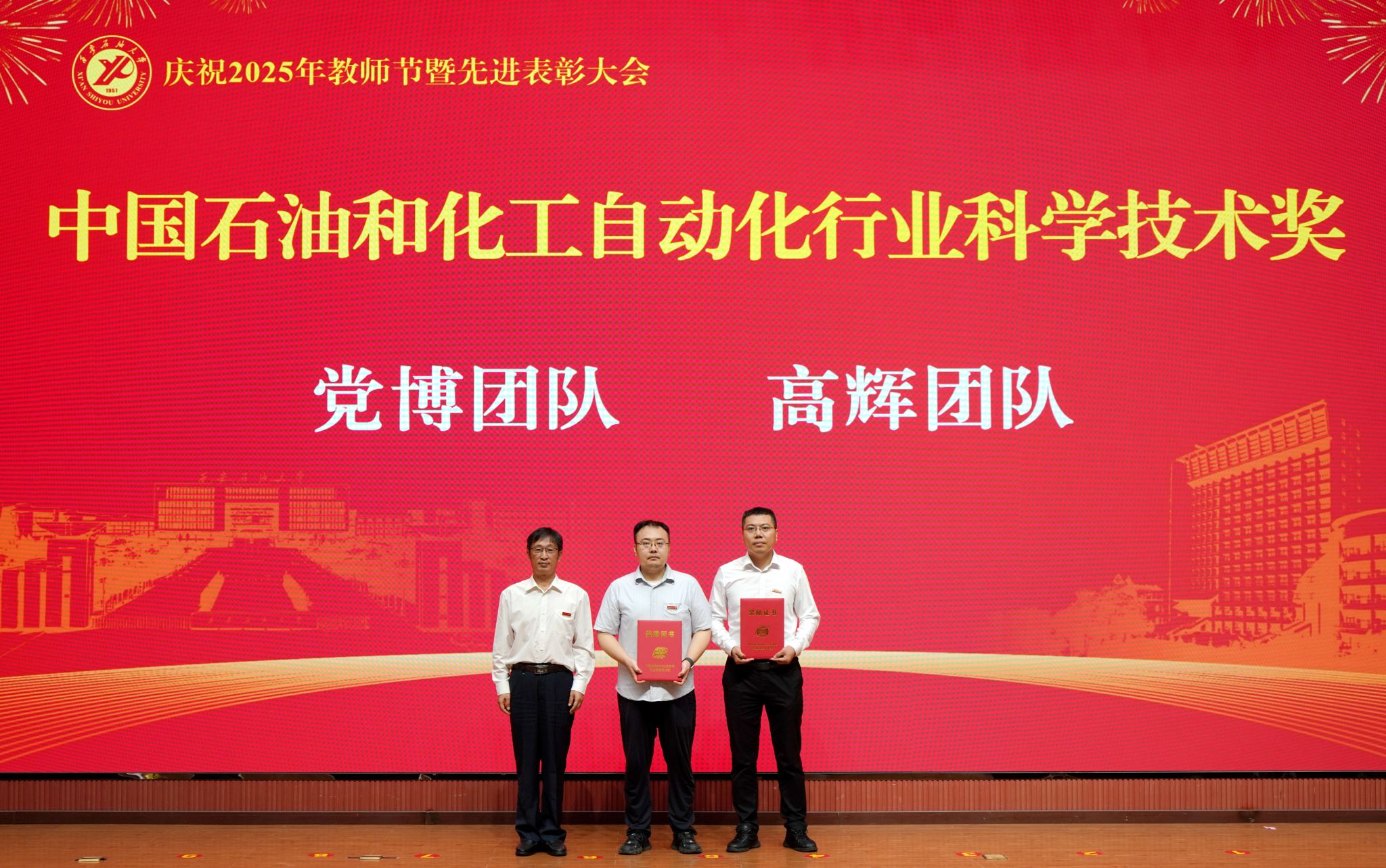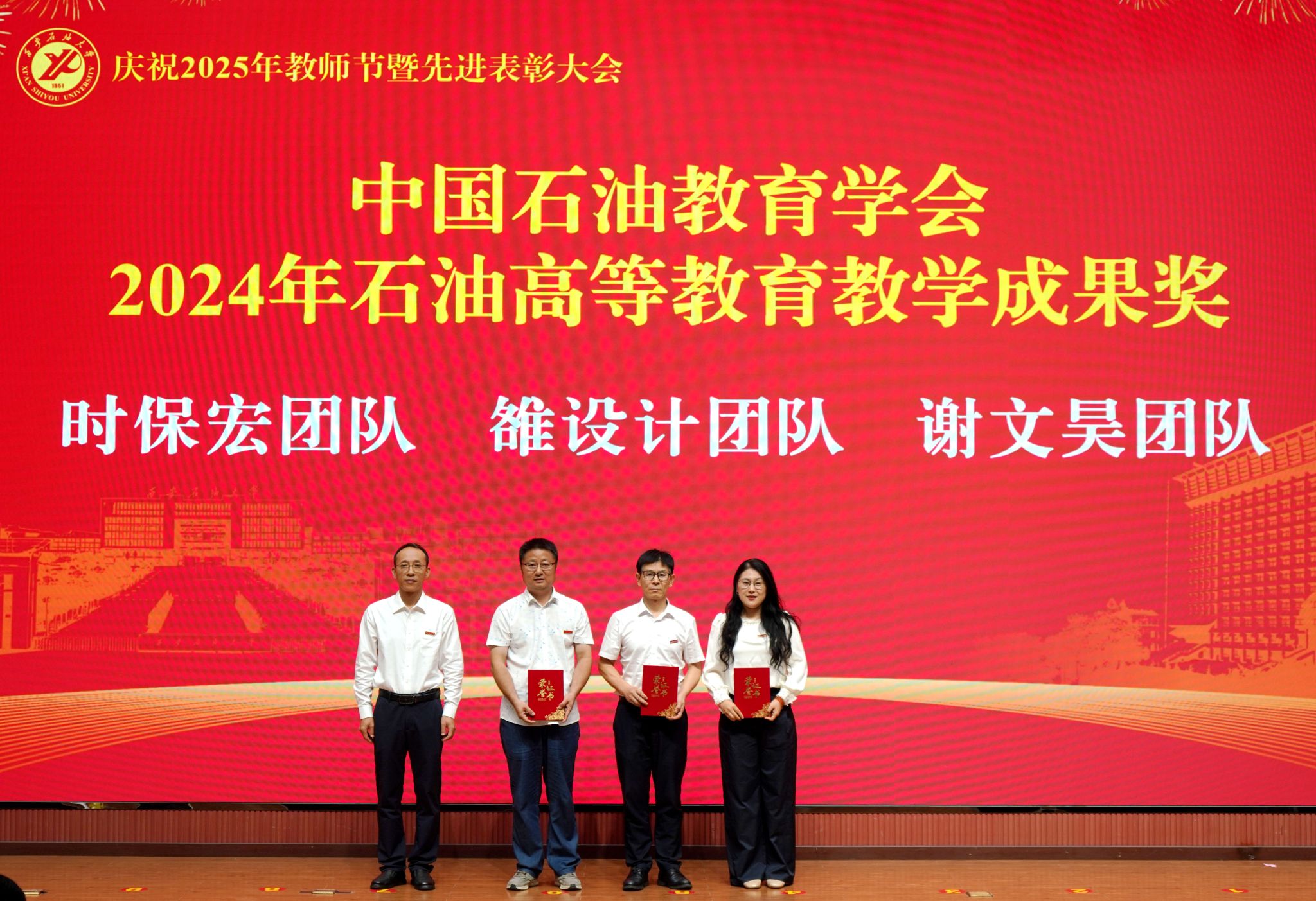 表彰大會(huì)在國(guó)歌聲中開始,校領(lǐng)導(dǎo)宣讀表彰決定,并為受表彰教師代表頒發(fā)證書和獎(jiǎng)?wù)?。校黨委副書記張木宣讀2024年度陜西省科學(xué)技術(shù)進(jìn)步獎(jiǎng)、國(guó)家重大人才工程和國(guó)家青年人才工程入選名單;校黨委副書記、紀(jì)委書記、監(jiān)察專員王輝強(qiáng)宣讀陜西省高層次人才特殊支持計(jì)劃等人選名單;副校長(zhǎng)蘇文甫宣讀陜西高校優(yōu)秀青年人才支持計(jì)劃、陜西省“三秦博創(chuàng)”人才支持項(xiàng)目、中國(guó)石油和化工自動(dòng)化行業(yè)科學(xué)技術(shù)獎(jiǎng)獲獎(jiǎng)名單;副校長(zhǎng)張榮軍宣讀2025年陜西省科技計(jì)劃項(xiàng)目(第三批、第四批)、陜西省2023年高等教育教學(xué)成果獎(jiǎng)和陜西省第十三屆基礎(chǔ)教育教學(xué)成果獎(jiǎng)獲獎(jiǎng)名單;副校長(zhǎng)張君濤宣讀陜西省課程思政精品課程,中國(guó)石油教育學(xué)會(huì)2024年石油高等教育教學(xué)成果獎(jiǎng)、首屆教師教學(xué)創(chuàng)新大賽、首屆課程思政教學(xué)大賽獲獎(jiǎng)名單;副校長(zhǎng)張驍勇宣讀《中共西安石油大學(xué)委員會(huì)關(guān)于表彰2025年師德先進(jìn)集體和先進(jìn)個(gè)人的決定》;副校長(zhǎng)趙健宣讀《西安石油大學(xué)關(guān)于表彰獎(jiǎng)勵(lì)“教書育人30年”教師的決定》《中共西安石油大學(xué)委員會(huì) 西安石油大學(xué)關(guān)于表彰2025年優(yōu)秀教師、先進(jìn)教育工作者的決定》;副校長(zhǎng)種宇宏宣讀第21屆陜西青年五四獎(jiǎng)?wù)潞偷诙萌珖?guó)大學(xué)生職業(yè)規(guī)劃大賽陜西省決賽獲獎(jiǎng)名單,全體與會(huì)校領(lǐng)導(dǎo)為受表彰教師代表頒發(fā)證書和獎(jiǎng)?wù)隆?/p>
