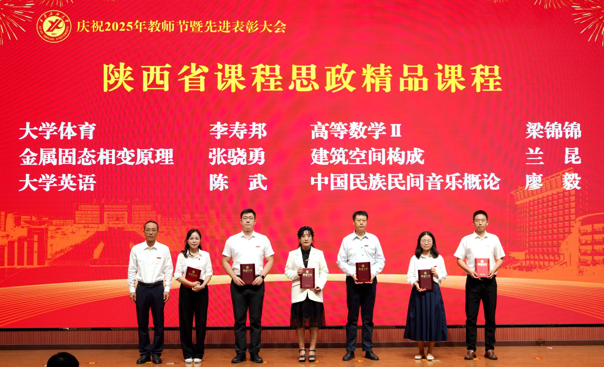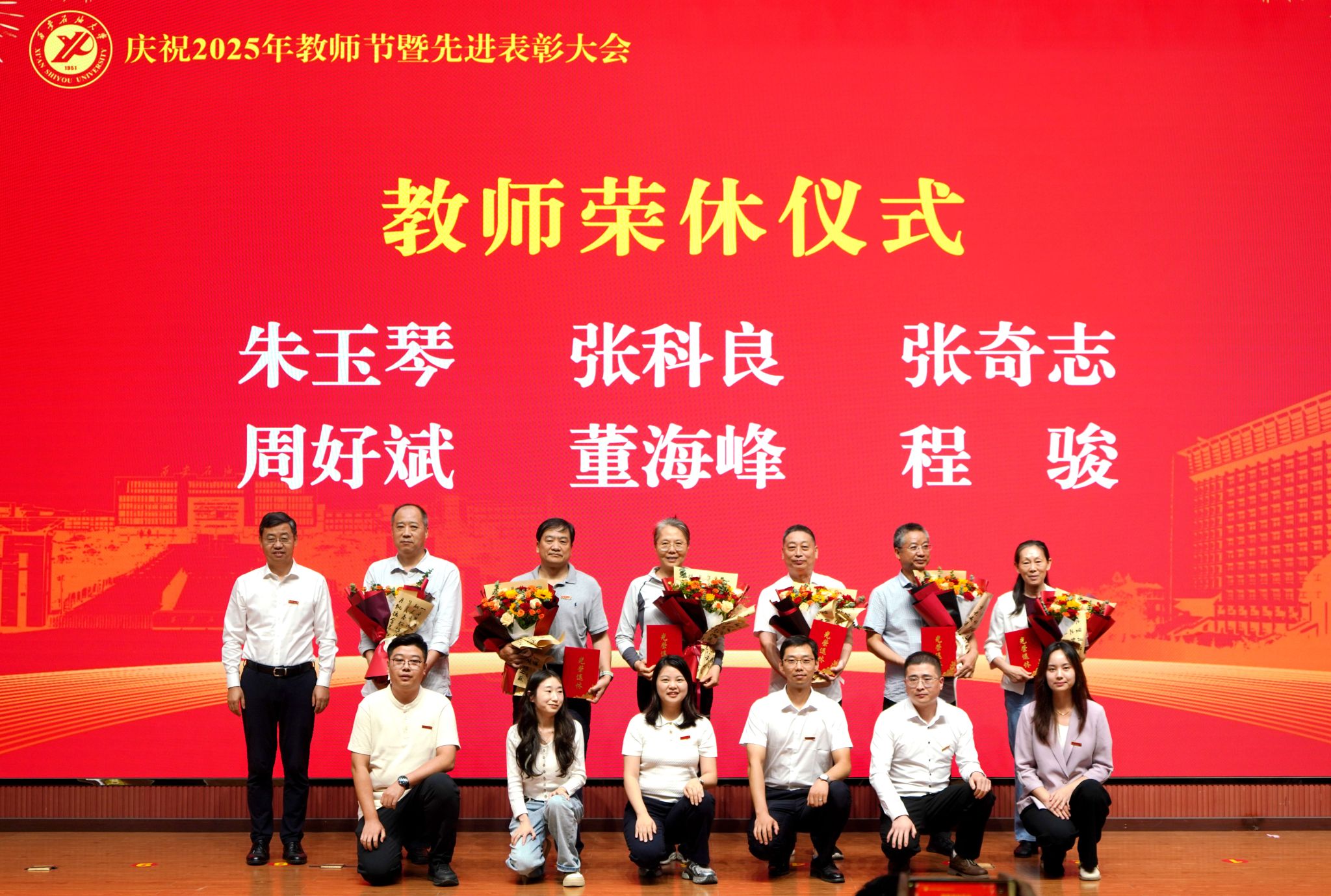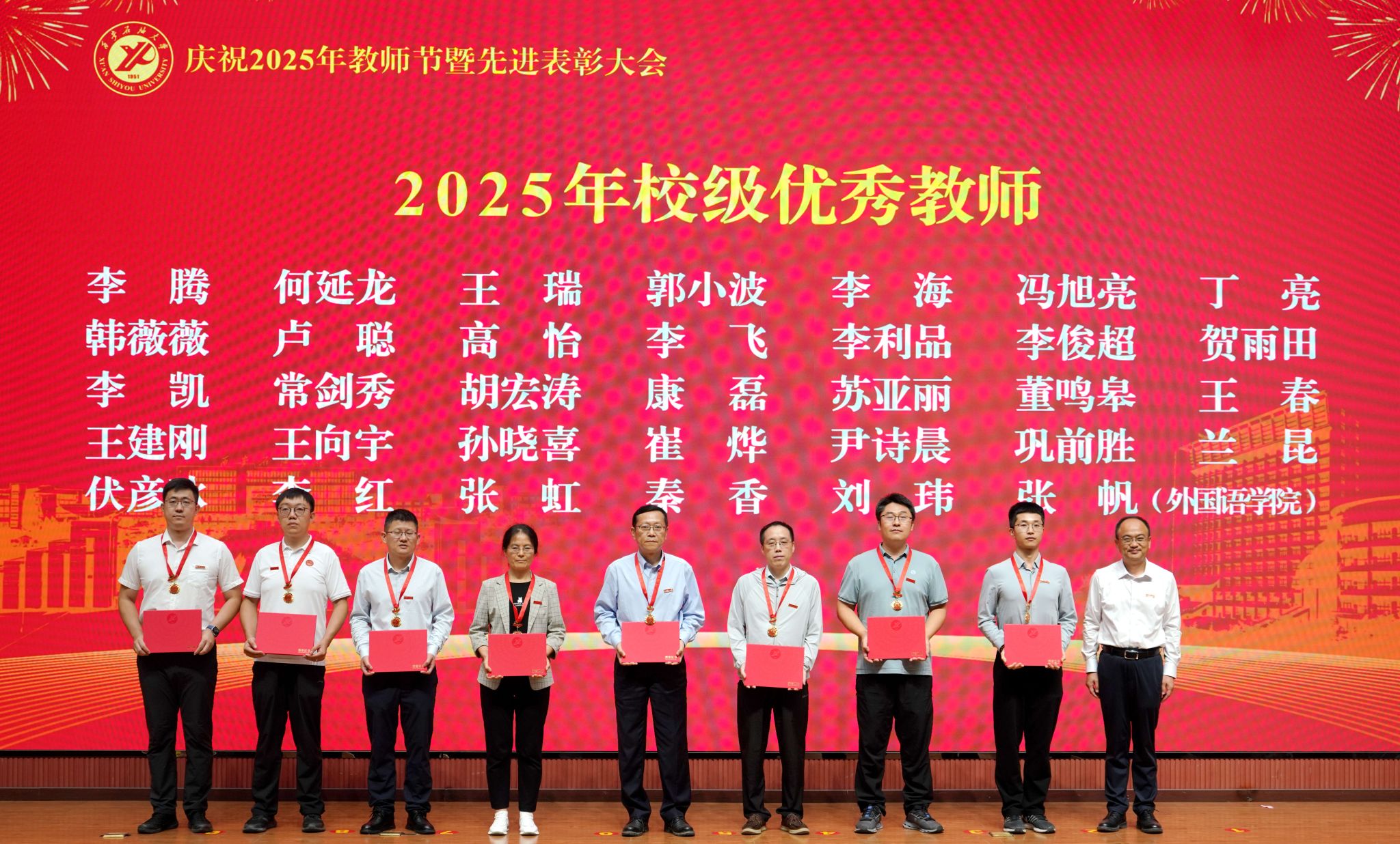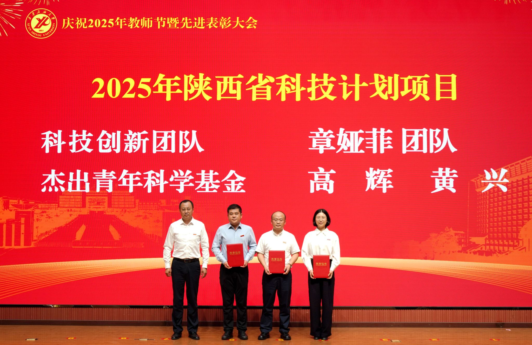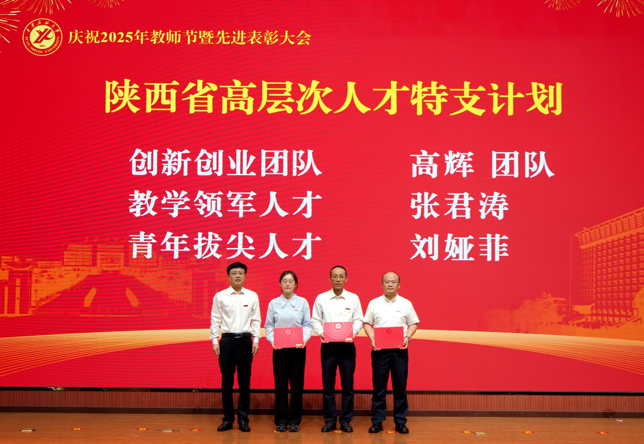 表彰大會(huì)在國(guó)歌聲中開始,校領(lǐng)導(dǎo)宣讀表彰決定,并為受表彰教師代表頒發(fā)證書和獎(jiǎng)?wù)?。校黨委副書記張木宣讀2024年度陜西省科學(xué)技術(shù)進(jìn)步獎(jiǎng)、國(guó)家重大人才工程和國(guó)家青年人才工程入選名單;校黨委副書記、紀(jì)委書記、監(jiān)察專員王輝強(qiáng)宣讀陜西省高層次人才特殊支持計(jì)劃等人選名單;副校長(zhǎng)蘇文甫宣讀陜西高校優(yōu)秀青年人才支持計(jì)劃、陜西省“三秦博創(chuàng)”人才支持項(xiàng)目、中國(guó)石油和化工自動(dòng)化行業(yè)科學(xué)技術(shù)獎(jiǎng)獲獎(jiǎng)名單;副校長(zhǎng)張榮軍宣讀2025年陜西省科技計(jì)劃項(xiàng)目(第三批、第四批)、陜西省2023年高等教育教學(xué)成果獎(jiǎng)和陜西省第十三屆基礎(chǔ)教育教學(xué)成果獎(jiǎng)獲獎(jiǎng)名單;副校長(zhǎng)張君濤宣讀陜西省課程思政精品課程,中國(guó)石油教育學(xué)會(huì)2024年石油高等教育教學(xué)成果獎(jiǎng)、首屆教師教學(xué)創(chuàng)新大賽、首屆課程思政教學(xué)大賽獲獎(jiǎng)名單;副校長(zhǎng)張驍勇宣讀《中共西安石油大學(xué)委員會(huì)關(guān)于表彰2025年師德先進(jìn)集體和先進(jìn)個(gè)人的決定》;副校長(zhǎng)趙健宣讀《西安石油大學(xué)關(guān)于表彰獎(jiǎng)勵(lì)“教書育人30年”教師的決定》《中共西安石油大學(xué)委員會(huì) 西安石油大學(xué)關(guān)于表彰2025年優(yōu)秀教師、先進(jìn)教育工作者的決定》;副校長(zhǎng)種宇宏宣讀第21屆陜西青年五四獎(jiǎng)?wù)潞偷诙萌珖?guó)大學(xué)生職業(yè)規(guī)劃大賽陜西省決賽獲獎(jiǎng)名單,全體與會(huì)校領(lǐng)導(dǎo)為受表彰教師代表頒發(fā)證書和獎(jiǎng)?wù)隆?/p>