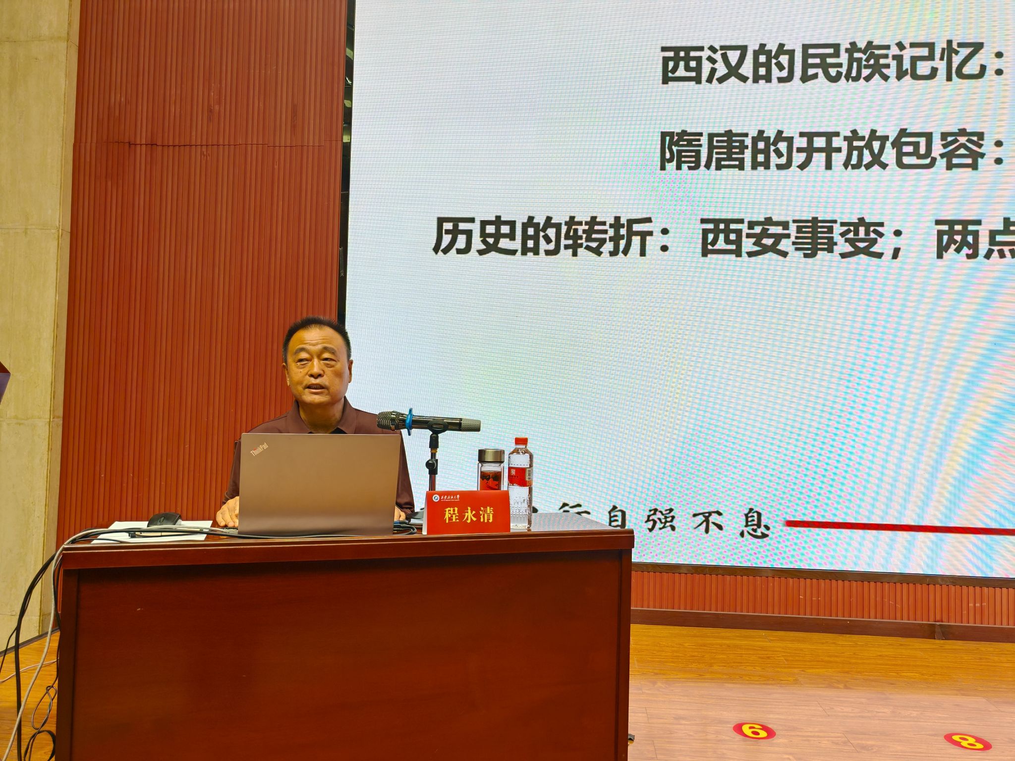 程永清圍繞“紅色血脈:學(xué)校成立的宏大歷史背景”“自強(qiáng)不息:艱難曲折的辦學(xué)歷程”“堅(jiān)定前行:文化價(jià)值和精神追求”三個(gè)方面,以豐富的史料和生動(dòng)的案例帶領(lǐng)新生深入學(xué)習(xí)。他從我國(guó)石油工業(yè)發(fā)展歷程與習(xí)仲勛等老一輩革命家對(duì)石油開(kāi)發(fā)的重大貢獻(xiàn)講起,闡述學(xué)校成立的歷史背景,回顧學(xué)校的建校歷史,解讀學(xué)校的辦學(xué)精神,展示學(xué)校的辦學(xué)成就。報(bào)告中穿插播放《孫鴻烈院士談父親》《第一屆畢業(yè)生武華》等珍貴視頻,以親歷者的講述直觀感受辦學(xué)的艱辛歷程。講述至動(dòng)情處,程永清以一句“羌笛何須怨楊柳”與臺(tái)下學(xué)生互動(dòng),同學(xué)們齊聲應(yīng)答“春風(fēng)不度玉門(mén)關(guān)”。這首千年古詩(shī)的應(yīng)和,不僅瞬間拉近了師生距離,更生動(dòng)詮釋了學(xué)校扎根西北、為國(guó)育才的堅(jiān)守與奉獻(xiàn),現(xiàn)場(chǎng)氣氛熱烈,掌聲雷動(dòng)。在梳理學(xué)校辦學(xué)歷程時(shí),他指出,學(xué)校誕生于新中國(guó)石油工業(yè)急需人才的關(guān)鍵時(shí)期,是新中國(guó)最早培養(yǎng)石油工業(yè)技術(shù)干部的學(xué)校之一。這一歷程始終與國(guó)家戰(zhàn)略緊密相連,承載著打破“中國(guó)貧油論”,助力國(guó)家能源安全的使命。學(xué)校在不同歷史階段始終堅(jiān)守“為國(guó)家石油工業(yè)培養(yǎng)人才”的初心,即使在1980年復(fù)辦時(shí),也服從全國(guó)石油專業(yè)整體布局,優(yōu)先恢復(fù)機(jī)械、儀器和經(jīng)管專業(yè),展現(xiàn)出無(wú)私奉獻(xiàn)的大局意識(shí)。在談及學(xué)校文化價(jià)值時(shí),他強(qiáng)調(diào),學(xué)校始終扎根西北熱土,背依中華民族祖脈秦嶺,面臨滋養(yǎng)中華文明的渭水,從西周禮樂(lè)文化中汲取養(yǎng)分,更在長(zhǎng)期辦學(xué)中形成了以“石油紅”為象征的特色文化符號(hào)。一代代西石大人秉持校風(fēng)和校訓(xùn),涌現(xiàn)出顧心怡、馮家潮、夏述明等優(yōu)秀校友,他們的科研成果與奮斗故事,正是學(xué)校精神的生動(dòng)體現(xiàn)。