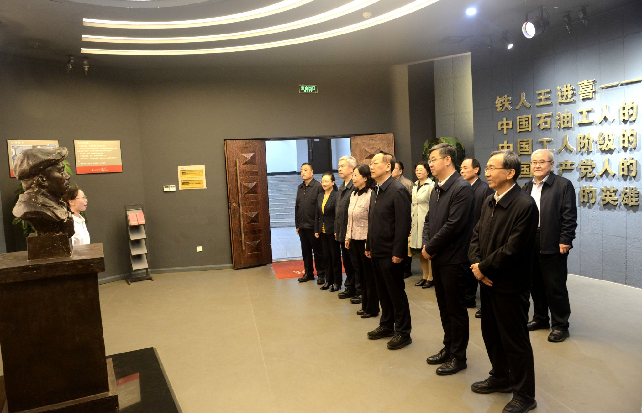 揭牌儀式前,全體人員懷著崇敬的心情前往杜斌丞雕像前敬獻(xiàn)花籃、鞠躬拜謁,深切緬懷。隨后參觀了鐵人王進(jìn)喜紀(jì)念館和校史館。