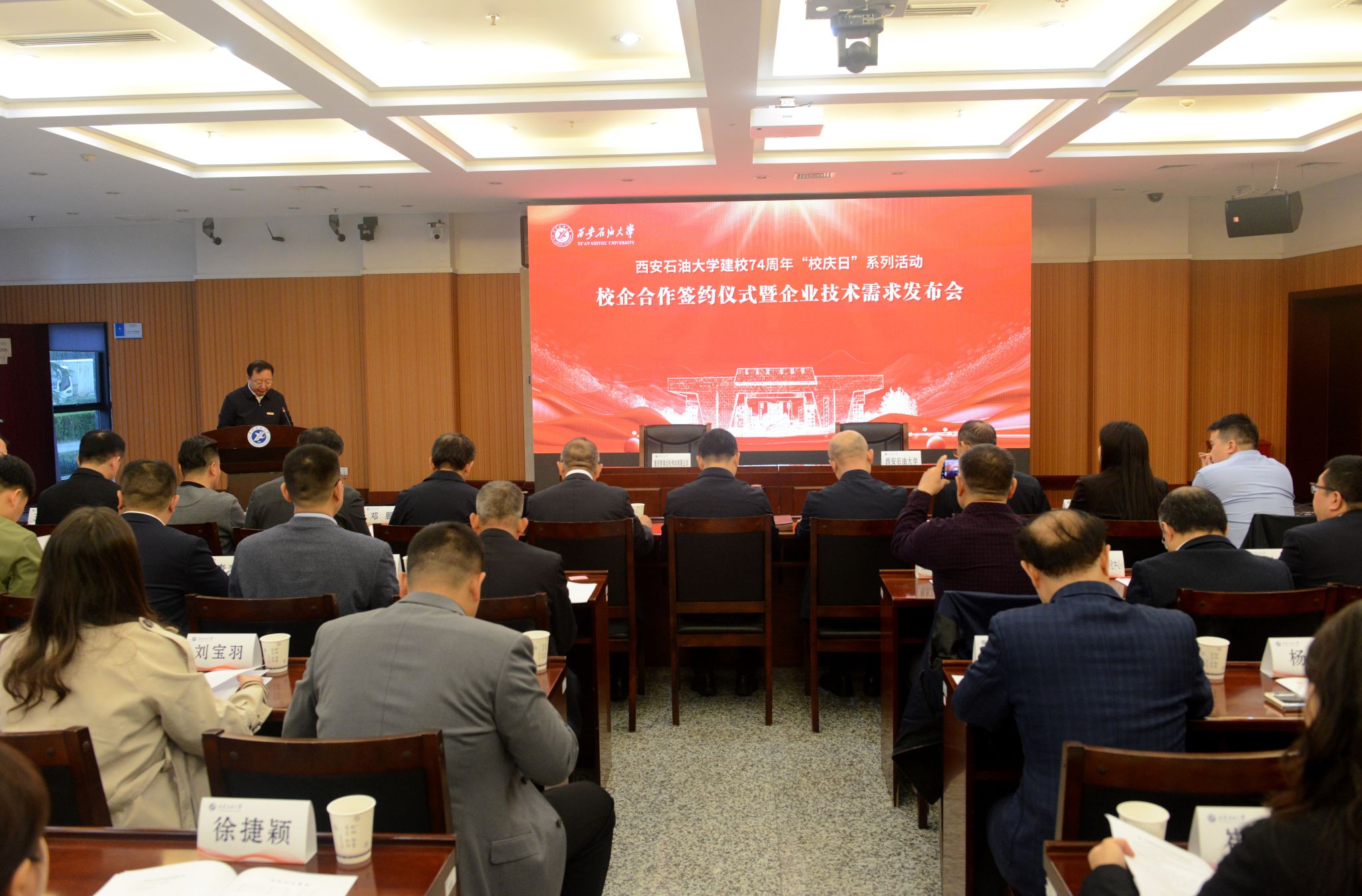 各企業(yè)有關(guān)代表及我校黨委辦公室(校長辦公室)、科研處、校友工作與合作交流處、石油工程學(xué)院、化學(xué)化工學(xué)院、電子工程學(xué)院、機(jī)械工程學(xué)院、材料科學(xué)與工程學(xué)院、計(jì)算機(jī)學(xué)院、繼續(xù)教育學(xué)院負(fù)責(zé)同志和科研團(tuán)隊(duì)代表、教師代表參加會議。