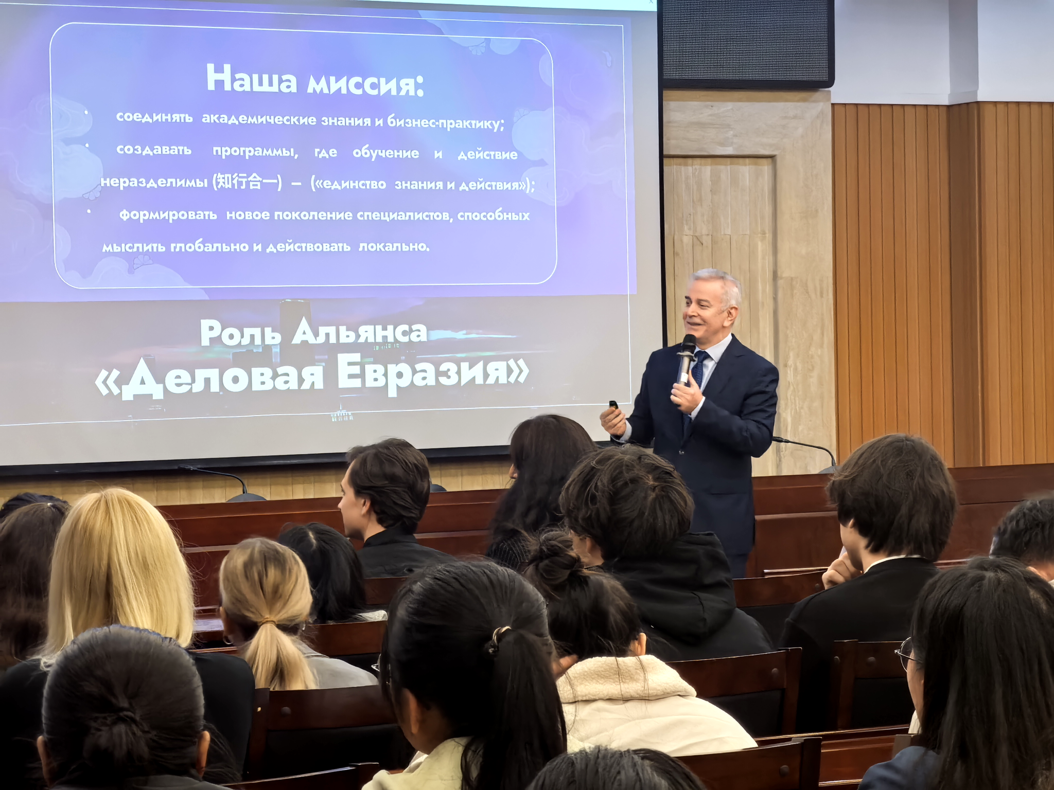 伊姆蘭·阿克佩羅夫在題為《歐亞地區(qū)商業(yè)教育轉(zhuǎn)型研究》的學(xué)術(shù)報(bào)告中,提出當(dāng)代教育的三類重要挑戰(zhàn),即理論與實(shí)踐的脫節(jié)、數(shù)字化轉(zhuǎn)型和跨文化合作,進(jìn)而介紹融合學(xué)術(shù)知識(shí)與商業(yè)實(shí)踐的“歐亞專家”一體化教育新模式。他認(rèn)為中國在未來世界發(fā)展格局中具有重要影響,鼓勵(lì)師生知行合一,持續(xù)提升國際視野和創(chuàng)業(yè)思維。