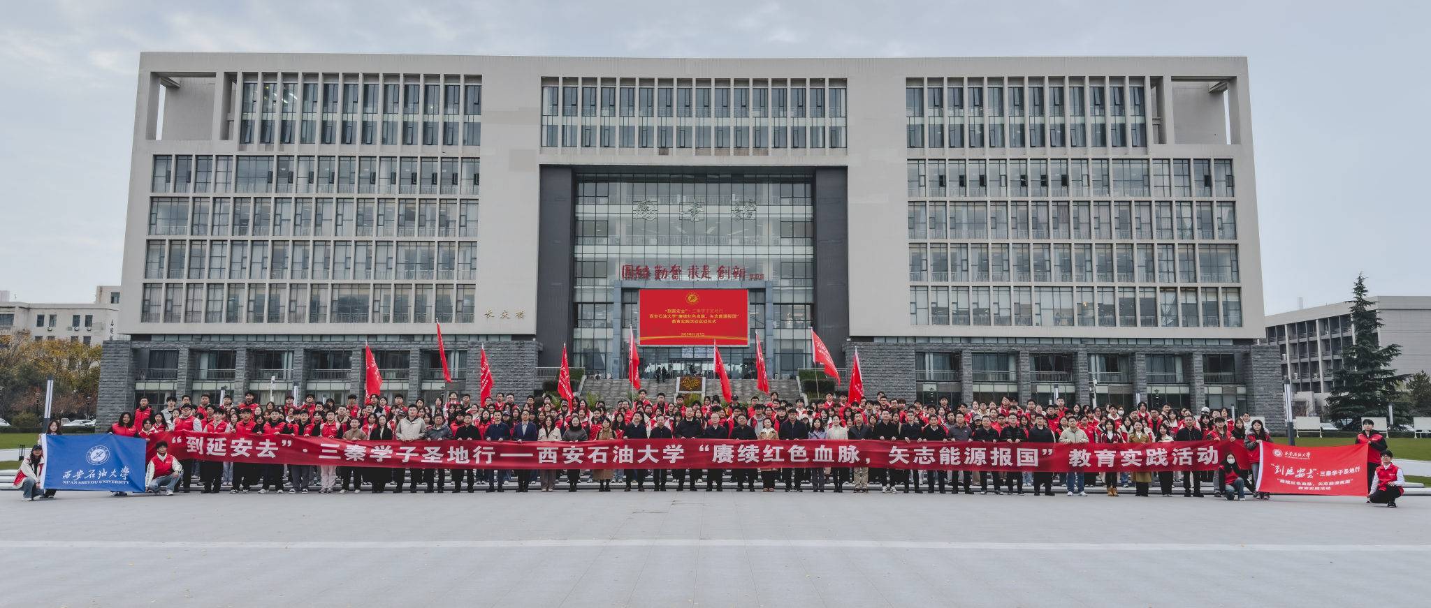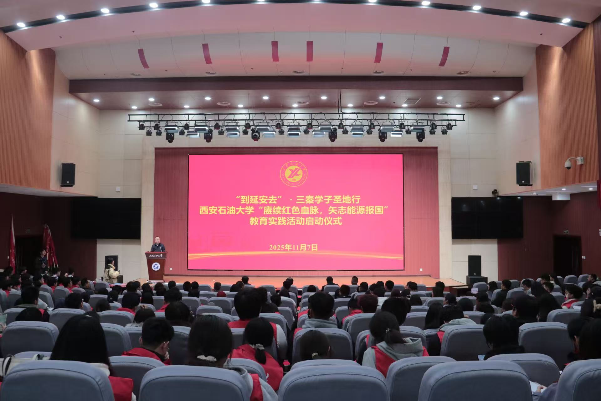 為深入貫徹習近平總書記關于“延安精神是黨的寶貴精神財富,要代代傳承下去”的重要指示精神,用好延安革命圣地豐富的紅色資源,充分發(fā)揮育人作用,根據(jù)陜西省委教育工委《關于組織開展“到延安去”·三秦學子圣地行活動的通知》要求,推動紅色文化資源深度融入“大思政課”建設和立德樹人全過程,11月7日下午,學校在鄠邑校區(qū)弘石學術報告廳舉行“到延安去”?三秦學子圣地行—西安石油大學“賡續(xù)紅色血脈,矢志能源報國”教育實踐活動啟動儀式。副校長種宇宏出席儀式并講話,黨委組織部、黨委學生工作部、校團委、馬克思主義學院、繼續(xù)教育學院等單位負責人,各院(系)學生工作負責人,團委(團總支)書記,學生黨支部書記及預備黨員代表,第十八期校級青年馬克思主義者干部培訓班優(yōu)秀學員代表,團學骨干代表,2025級班級團支部書記代表400余人參加儀式。
