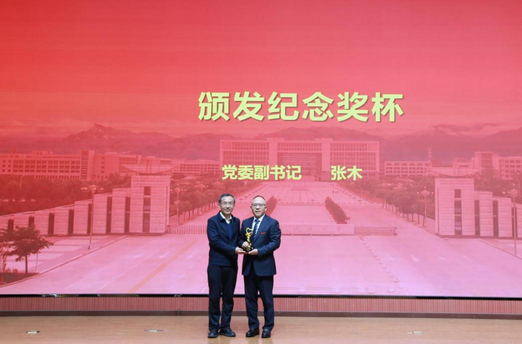 張木滿懷深情地宣讀《騰輝助學(xué)金廿周年慶典紀(jì)念冊》親筆序言,追憶1988年與何榮校友相識(shí)的點(diǎn)滴,激動(dòng)與感恩之情溢于言表,他深情地贊嘆何榮校友求學(xué)時(shí)的奮進(jìn)拼搏,與事業(yè)維艱之時(shí)仍堅(jiān)持回饋母校的赤子情懷。隨后,張木為何榮校友頒發(fā)“廿年初心?資助育人功勛獎(jiǎng)”紀(jì)念獎(jiǎng)杯,那沉甸甸的獎(jiǎng)杯滿載著全校師生對他二十年堅(jiān)守育人初心的崇高敬意,現(xiàn)場掌聲經(jīng)久不息。