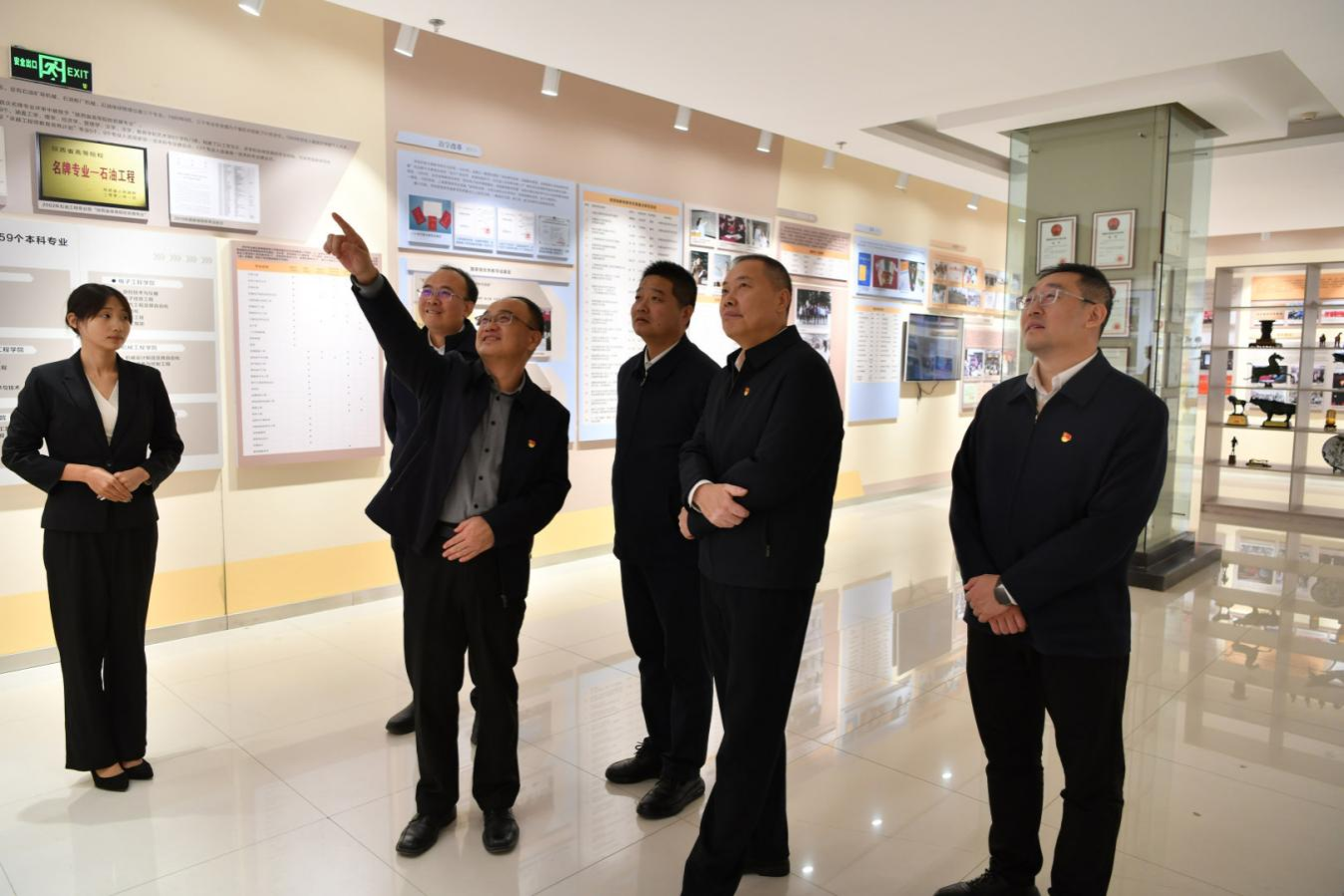 楊健、焦群朝一行與副校長趙健、黨委辦公室(校長辦公室)負(fù)責(zé)同志共同參觀我校鐵人王進(jìn)喜紀(jì)念館和校史館,開展沉浸式學(xué)習(xí)交流。大家先后在鐵人王進(jìn)喜紀(jì)念館鉆井設(shè)備實物、會戰(zhàn)場景復(fù)原展區(qū)及校史館校友事跡、學(xué)校發(fā)展成果展前駐足停留,在珍貴史料與生動場景中追尋精神根脈、感悟辦學(xué)初心。趙健結(jié)合展區(qū)實物與歷史背景,深入解讀了鐵人王進(jìn)喜“攻堅克難、無私奉獻(xiàn)”的精神內(nèi)核,詳細(xì)講述了學(xué)校自創(chuàng)辦以來,從服務(wù)行業(yè)發(fā)展到助力國家能源事業(yè)高質(zhì)量發(fā)展的奮進(jìn)歷程。在參觀過程中,雙方圍繞黨建賦能、文化傳承、人才培養(yǎng)等內(nèi)容深入交流,在精神共鳴中凝聚合作共識。