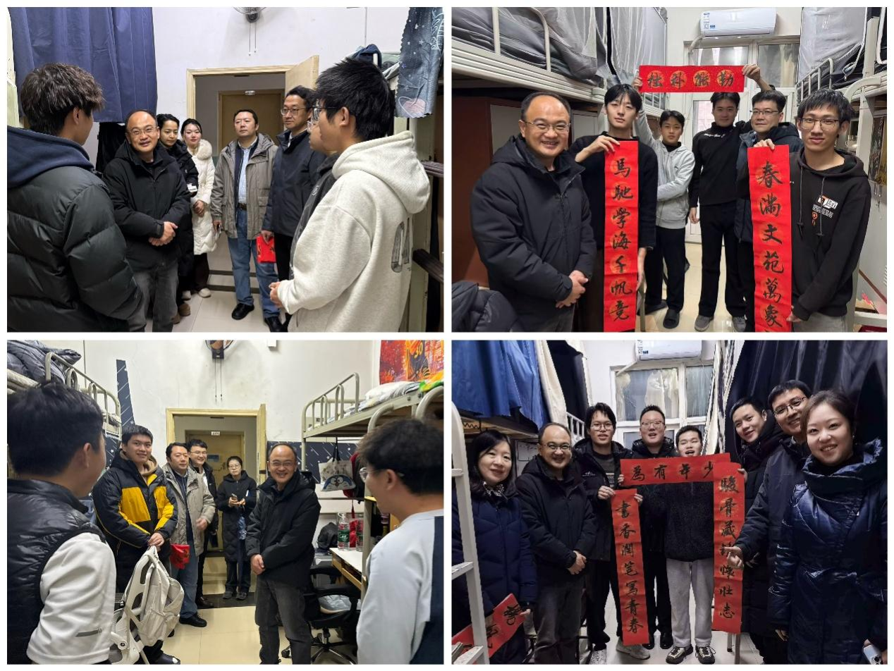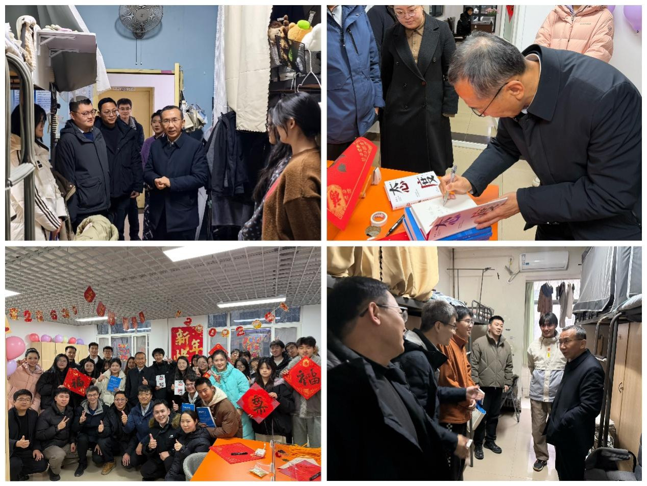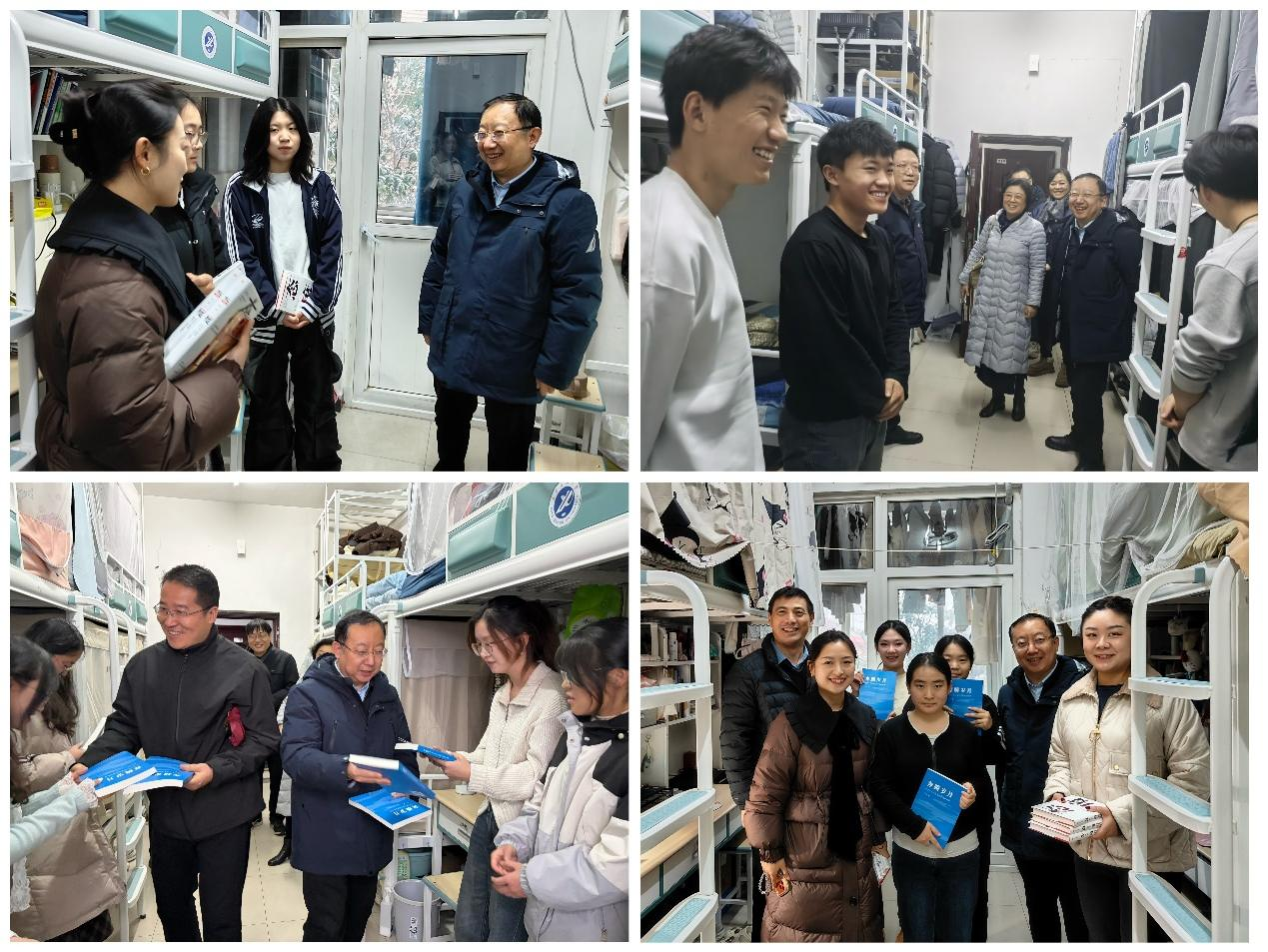 歲末迎新,暖意融融。在2026年元旦佳節(jié)來臨之際,學校領導深入各學院學生宿舍,走訪慰問留校學子,不僅通過贈送精心挑選的書籍、親筆書寫的對聯(lián)等方式,送上真摯的新年祝福,還與同學們親切暢談學習生活與未來規(guī)劃,傳遞學校的深切關懷與殷切期許,讓初雪籠罩的校園滿溢溫情。學生工作部(處)、研究生工作部以及各院(系)相關負責同志陪同走訪。