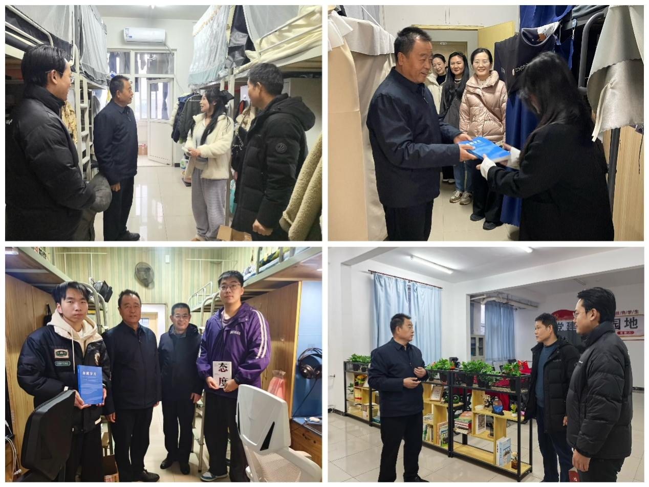副校長種宇宏先后前往機械工程學院、理學院、體育學院和音樂系開展元旦慰問活動。在2025級新生宿舍,他親手將一本本勵志書籍送到同學們手中,扉頁上的寄語承載著對青年學子的深切期望,鼓勵大家在書香浸潤中涵養(yǎng)品格、增長學識;他與新生們親切攀談,關切詢問入校后的適應情況、學習節(jié)奏、生活起居及課余生活,送上真摯的新年祝福,叮囑大家珍惜寶貴的大學時光,腳踏實地、勤學善思,在校園中不斷積累知識、錘煉本領,收獲充實的成長歷程。