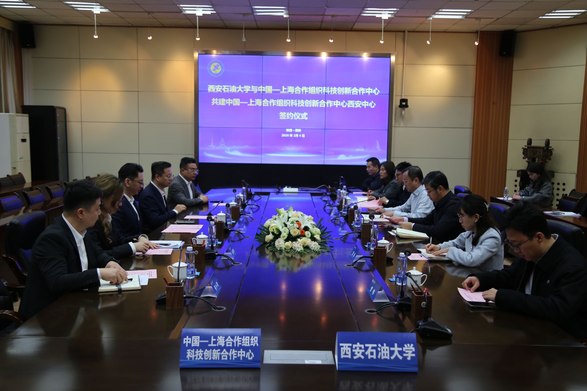 2月4日下午,我校與中國(guó)—上海合作組織科技創(chuàng)新合作中心共建中國(guó)—上海合作組織科技創(chuàng)新合作中心西安中心(以下簡(jiǎn)稱“西安中心”)簽約儀式在雁塔校區(qū)會(huì)議中心第二會(huì)議室舉行。簽約儀式前,校黨委書記常江在貴賓室會(huì)見(jiàn)中國(guó)—上海合作組織科技創(chuàng)新合作中心主任趙中元、副主任單曉旭、副秘書長(zhǎng)羅一鳴、西安中心(籌)籌備組組長(zhǎng)何小奇、西安中心(籌)籌備組副組長(zhǎng)陳文一行。校長(zhǎng)王進(jìn)富、副校長(zhǎng)張榮軍出席會(huì)見(jiàn)及簽約儀式。簽約儀式由張榮軍主持。