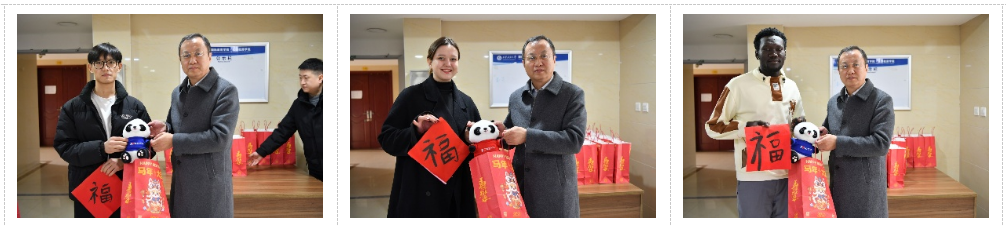 慰問期間,張榮軍向在場國際學(xué)生贈送慰問品,寄語學(xué)生馬年如意,并與大家合影留念。