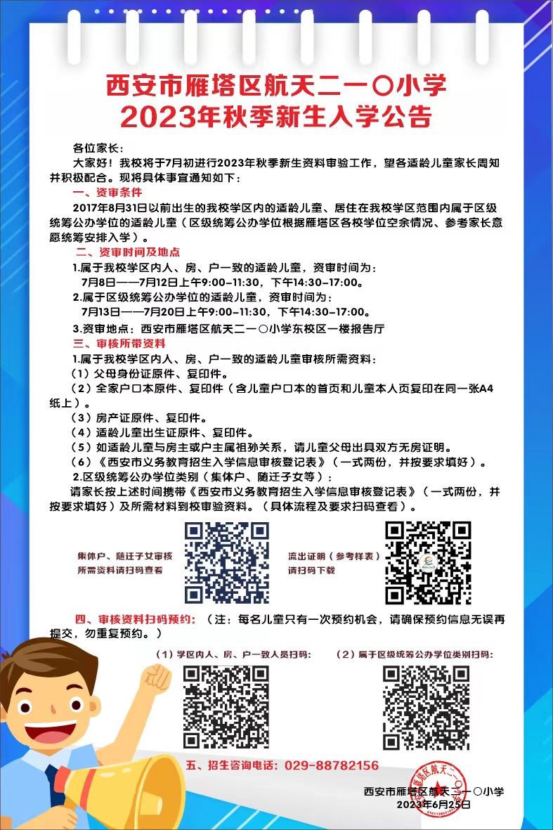 大家好!根據(jù)西安市雁塔區(qū)航天二一〇小學(xué)對轄區(qū)內(nèi)適齡兒童2023年秋季新生入學(xué)的通知安排,現(xiàn)將入學(xué)公告公布如下,請各位家長提前準(zhǔn)備資料,按時進(jìn)行資料審驗(yàn)。