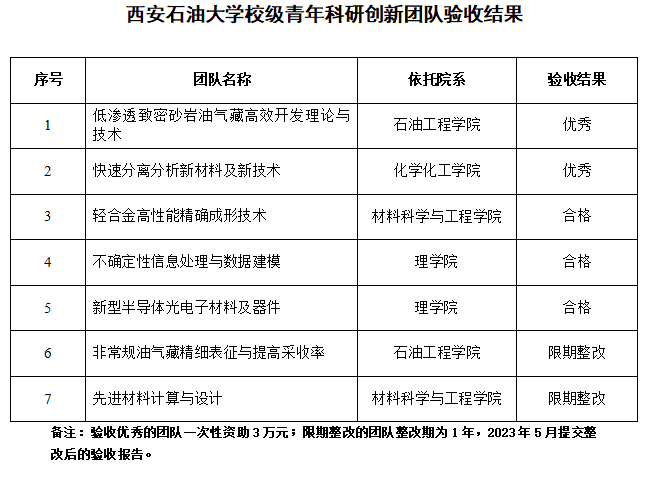 根據(jù)《西安石油大學(xué)科研創(chuàng)新團(tuán)隊建設(shè)與管理辦法》與《西安石油大學(xué)青年科研創(chuàng)新團(tuán)隊建設(shè)與管理辦法》(西石大科〔2021〕23號)文件精神及學(xué)校關(guān)于團(tuán)隊考核的通知要求,經(jīng)團(tuán)隊自評申報、院系審核、科技處審查、學(xué)校組織專家評審等環(huán)節(jié),現(xiàn)將各類團(tuán)隊期滿驗收和中期檢查結(jié)果公示如下。