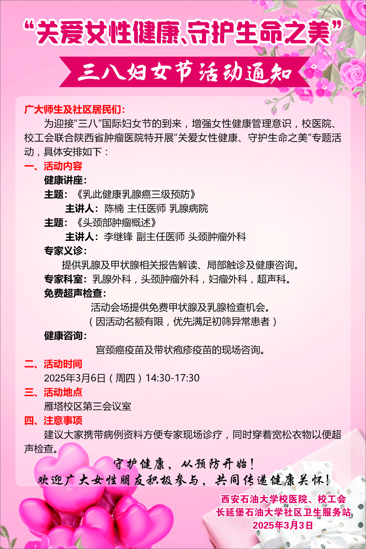 校醫(yī)院、校工會(huì)聯(lián)合舉辦“關(guān)愛女性健康、守護(hù)生命之美”__三八婦女節(jié)活動(dòng)通知