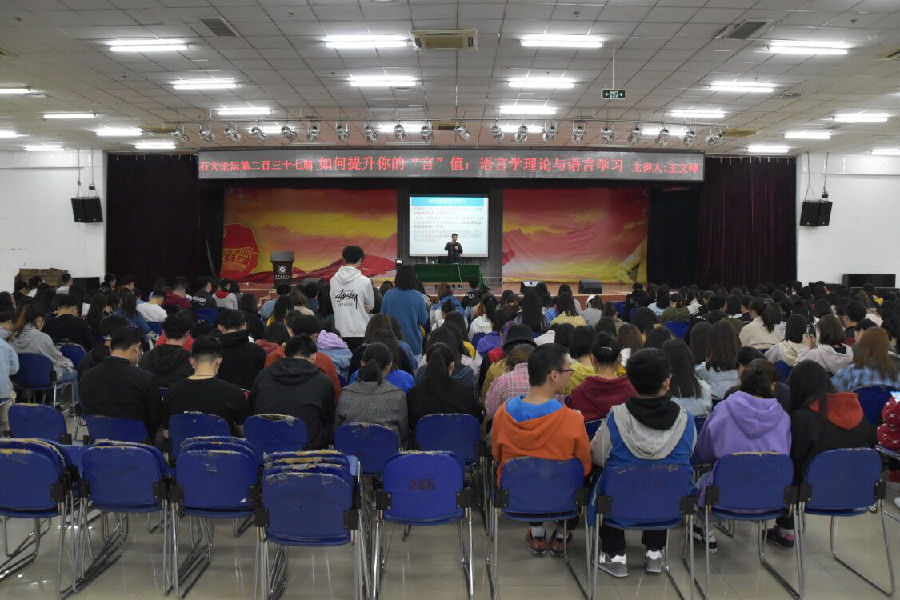 3月26日晚,由校團(tuán)委主辦、外國(guó)語學(xué)院團(tuán)委學(xué)生會(huì)承辦的石大青年論壇第237期“如何提升你的‘言’值:語言學(xué)理論與語言學(xué)習(xí)”在鄠邑校區(qū)騰輝大學(xué)生活動(dòng)中心舉行,本期論壇邀請(qǐng)了我院青年教師王文峰博士擔(dān)任主講,我院全體學(xué)生以及學(xué)校其他院系學(xué)生參加了此次講座。