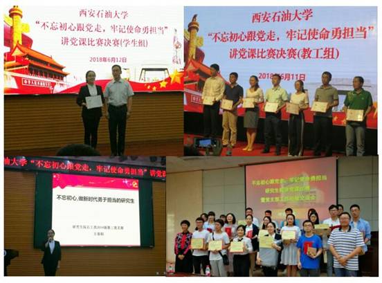 ——開(kāi)展院級(jí)“講黨課”比賽活動(dòng)。2018年5月,研究生院黨委啟動(dòng)黨支部書(shū)記講黨課比賽活動(dòng)。經(jīng)前期各黨支部報(bào)名推薦、學(xué)院建設(shè)講黨課專(zhuān)題網(wǎng)絡(luò)學(xué)習(xí)頁(yè)面、組織開(kāi)展講黨課微視頻網(wǎng)絡(luò)投票、年級(jí)黨支部評(píng)議和輔導(dǎo)員推薦、研究生院黨委評(píng)審等環(huán)節(jié)概況,于5月24日舉行院級(jí)決賽,對(duì)20余名講黨課獲獎(jiǎng)黨員進(jìn)行了表彰獎(jiǎng)勵(lì)。經(jīng)選拔,研究生院黨委選送的石工類(lèi)2016級(jí)第三黨支部宣傳委員兼紀(jì)檢委員王春陽(yáng)、教職工黨支部宣傳委員劉勝勇雙雙進(jìn)入全校決賽,其中王春陽(yáng)以全校第一名成績(jī)榮獲決賽一等獎(jiǎng)(學(xué)生組),劉勝勇榮獲全校決賽三等獎(jiǎng)(教工組)。