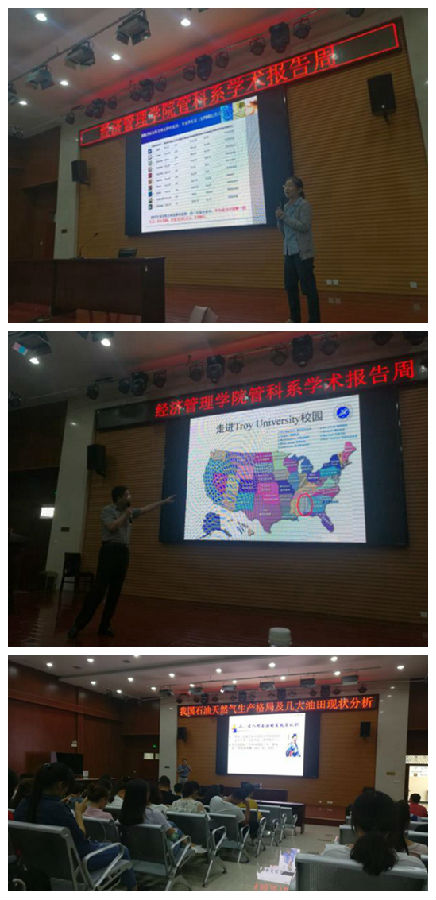 第一場(chǎng)講座是由國(guó)家一級(jí)注冊(cè)建造師尹志國(guó)老師介紹了“BIM技術(shù)的發(fā)展現(xiàn)狀及應(yīng)用”;第二場(chǎng)講座是由電子商務(wù)專業(yè)帶頭人王小寧教授解讀了“石油行業(yè)中電子商務(wù)的應(yīng)用情況”;第三場(chǎng)講座是由李俊亭副教授講述了他在美期間的“訪學(xué)見聞”;第四場(chǎng)講座是由管科系主任杜小武副教授做了題為“我國(guó)石油天然氣生產(chǎn)格局及幾大油田現(xiàn)狀分析”的石油科普教育。