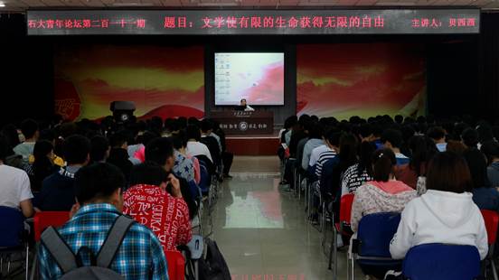 為進(jìn)一步開(kāi)展好第二屆“書(shū)香校園”建設(shè)活動(dòng),由校團(tuán)委主辦,化學(xué)化工學(xué)院承辦的第211期石大青年論壇之“書(shū)香校園”建設(shè)主題報(bào)告于2018年4月17日晚19:00在鄠邑校區(qū)騰輝活動(dòng)中心舉行。報(bào)告特邀柳青文學(xué)獎(jiǎng)獲得者、陜西青年作家貝西西主講,學(xué)院黨委副書(shū)記劉小波、校團(tuán)委老師周宇、學(xué)院2017級(jí)輔導(dǎo)員楊夢(mèng)琳及390余名同學(xué)聆聽(tīng)報(bào)告。
