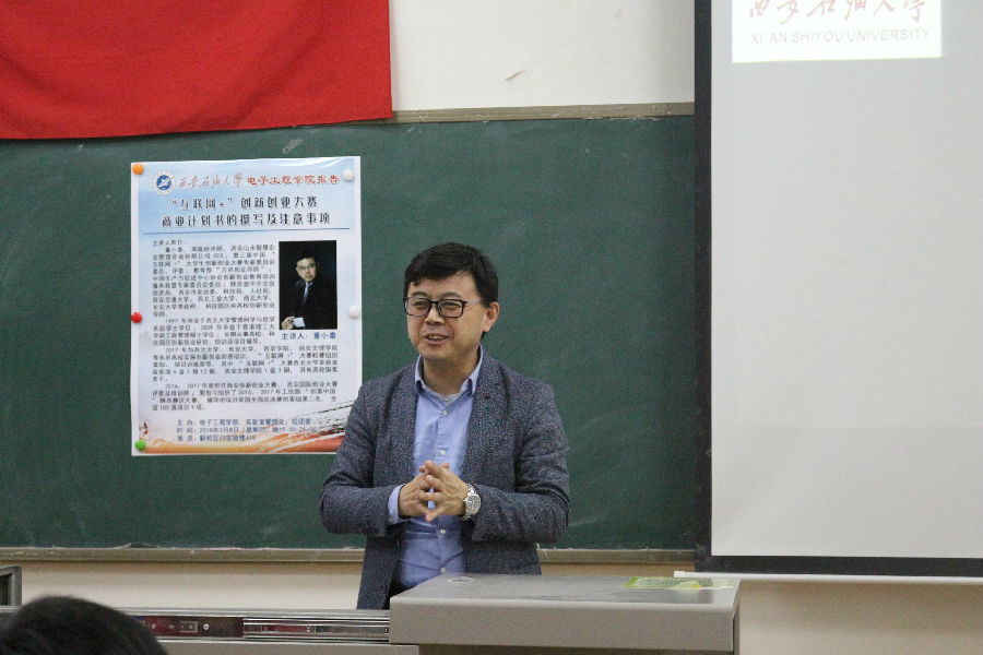 3月8日晚19點,電子工程學(xué)院在鄠邑校區(qū)C3實驗樓419教室成功舉辦了題為《商業(yè)計劃書的撰寫及注意事項》的專題講座。此次講座邀請到高級經(jīng)濟師、山水智慧企業(yè)管理咨詢有限公司CEO董小泰老師擔(dān)任主講。電子工程學(xué)院黨委副書記黃建禮、2016級輔導(dǎo)員梁琦、青年教師顏謹(jǐn)?shù)戎笇?dǎo)老師以及申報“互聯(lián)網(wǎng)+”創(chuàng)新創(chuàng)業(yè)項目的同學(xué)參加此次專題講座。