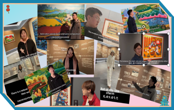 鄠邑農(nóng)民畫作為國家級非物質(zhì)文化遺產(chǎn),以原生態(tài)的鄉(xiāng)土題材、明快的色彩語言和質(zhì)樸的美學(xué)風(fēng)格蜚聲海內(nèi)外?;顒右潦?,學(xué)生通過鄠邑區(qū)農(nóng)民畫博物館專業(yè)講解員的講解和視頻觀看,系統(tǒng)學(xué)習(xí)了農(nóng)民畫六十余年的發(fā)展歷程,深刻理解了鄠邑農(nóng)民畫作品中蘊含的關(guān)中民俗、節(jié)慶文化與農(nóng)耕智慧。在隨后的實踐環(huán)節(jié)中,學(xué)生以小組為單位,結(jié)合英語語言優(yōu)勢與新媒體技術(shù)展開創(chuàng)作,進行英文講解以及視頻拍攝工作。為了提升視頻質(zhì)量,活動開展前,除了對英文腳本反復(fù)修改,很多學(xué)生還自學(xué)了一些攝影技術(shù)并進行分鏡腳本設(shè)計?;顒蝇F(xiàn)場,學(xué)生手持設(shè)備,穿梭于展廳進行多角度講解拍攝。
