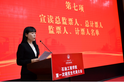 石油工程學(xué)院黨委組織員宋興淼向大會(huì)作籌備工作報(bào)告;學(xué)生工作辦公室主任史陽宣讀第一次研究生代表大會(huì)選舉辦法;博士研究生輔導(dǎo)員余靚豪宣讀總監(jiān)票人、總計(jì)票人、監(jiān)票人、計(jì)票人名單。