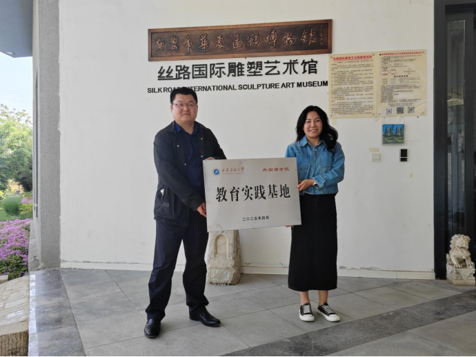 張建高、邱嶺與絲路國(guó)際雕塑文化藝術(shù)園負(fù)責(zé)人熱切交流。在交流中,雙方就合作的方向、內(nèi)容以及未來的發(fā)展規(guī)劃等進(jìn)行了深入探討,在大家的共同見證下,外國(guó)語(yǔ)學(xué)院在絲路國(guó)際雕塑文化藝術(shù)園教育實(shí)踐基地正式掛牌。