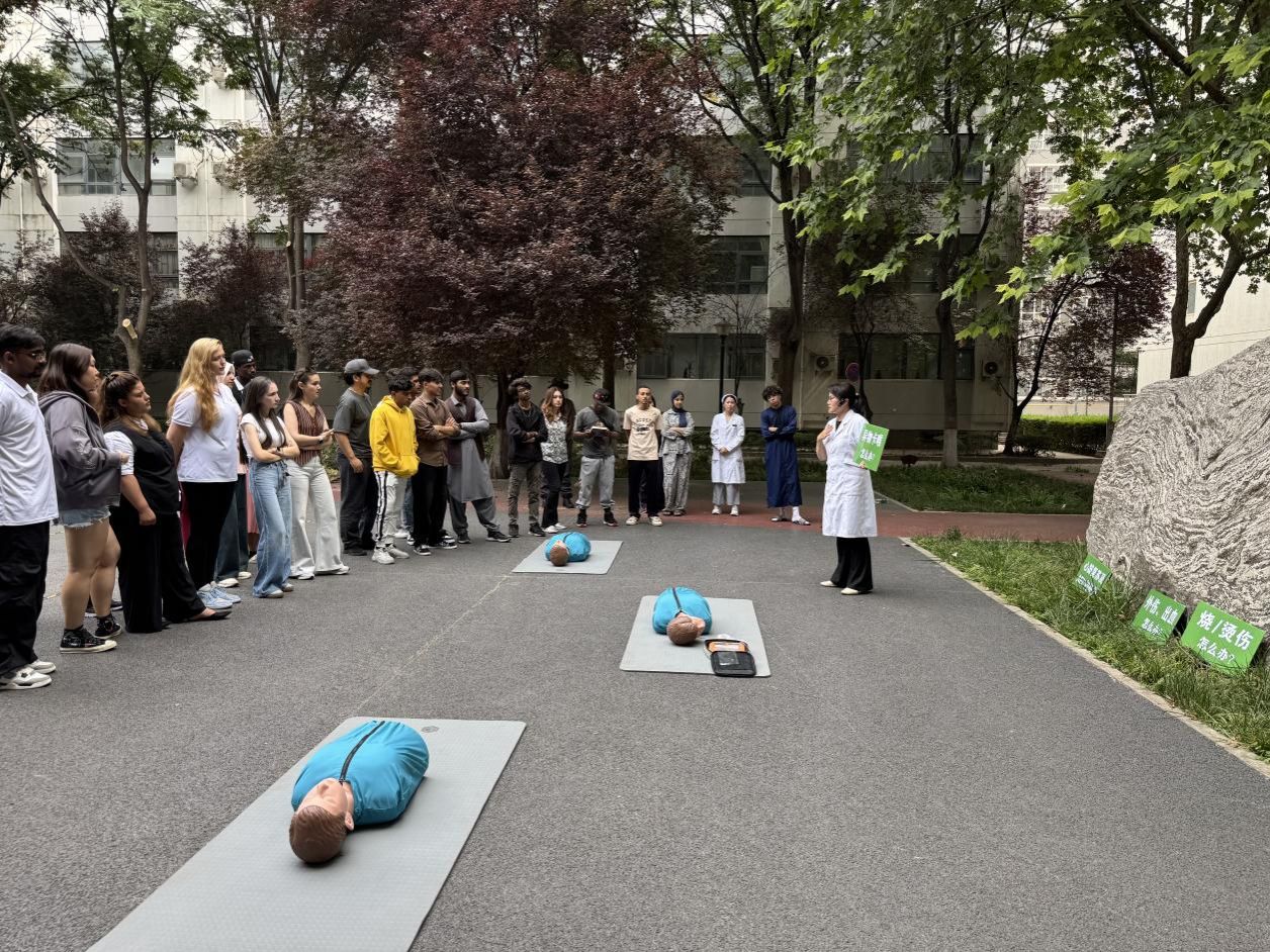 2025年6月5日上午,國際教育學(xué)院聯(lián)合校醫(yī)院在明德校區(qū)6號樓前廣場成功舉辦應(yīng)急救護(hù)專題培訓(xùn)活動。培訓(xùn)特邀校醫(yī)院中國紅十字會認(rèn)證救護(hù)師宋彥霞、譚亞護(hù)士以及李純護(hù)士現(xiàn)場講授,學(xué)院輔導(dǎo)員及20國40余名留學(xué)生積極參訓(xùn)。