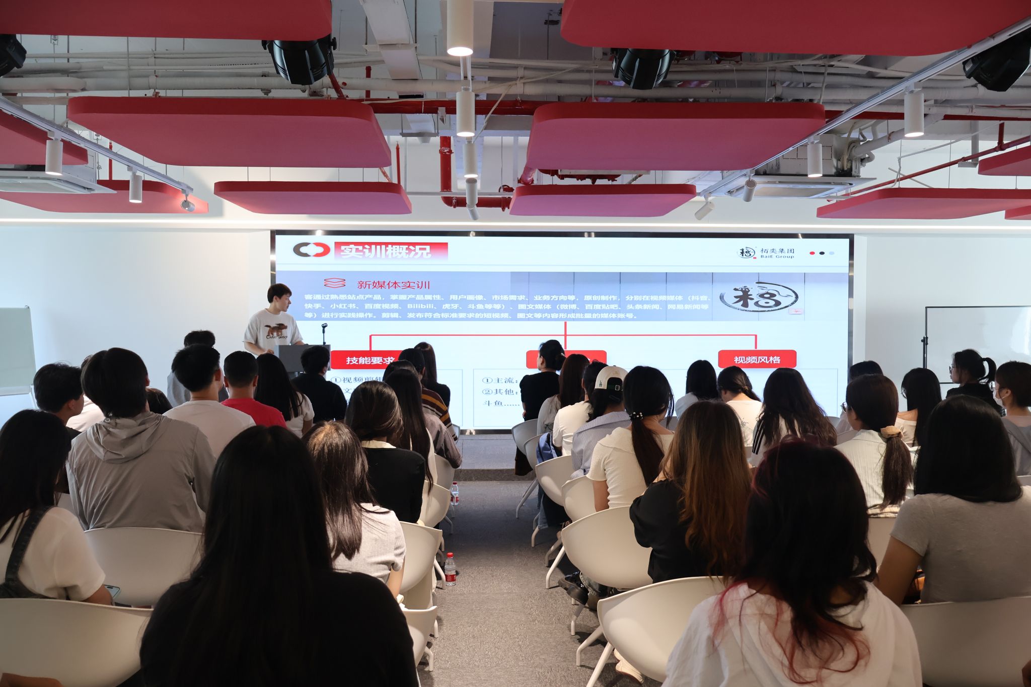 隨后,“刺氪”項目負責人王君詳細講解了短視頻行業(yè)的商業(yè)邏輯,涵蓋趨勢分析、內(nèi)容制作、軟件運營及數(shù)據(jù)分析等環(huán)節(jié)。技術(shù)指導崔瀚文則結(jié)合案例,拆解了游戲類短視頻的制作類型與全流程。人力資源總監(jiān)王汐妍介紹了“產(chǎn)教融合新媒體實訓營”的培訓方式、地點、要求、職業(yè)發(fā)展路徑、實訓就業(yè)等具體情況。同學們圍繞“零經(jīng)驗如何入行”“行業(yè)發(fā)展趨勢”等話題踴躍提問,并表示對實訓營非常感興趣,主動加群報名。