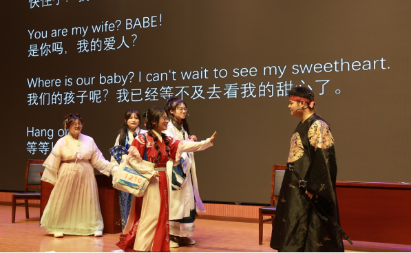 本次匯報演出共24個節(jié)目,分別由《英語電影賞析》《英語歌曲與英語文化》《中國文化推介》《跨文化交際視聽說》《英漢翻譯技巧與實踐》和《實用英語寫作》6門大學(xué)英語拓展課程的同學(xué)及教師參演。節(jié)目異彩紛呈,涵蓋了電影配音、拓展課程介紹、歌曲演唱、英語話劇、跨文化情景劇短視頻、舞蹈、相聲等多種形式。在本次課程匯演的舞臺上,外國語學(xué)院第一教學(xué)部拓展課程組教師溫情獻唱,致敬成長,傾情演繹歌曲《送你一朵小紅花》。他們從講臺走向舞臺,用溫暖而真摯的歌聲傳遞著對莘莘學(xué)子的關(guān)愛與期許。這首飽含鼓勵與祝福的旋律,在師生心中播撒下溫暖與力量,成為匯演中一抹動人的亮色,生動詮釋了和諧融洽、積極向上的校園文化氛圍與教育溫度。